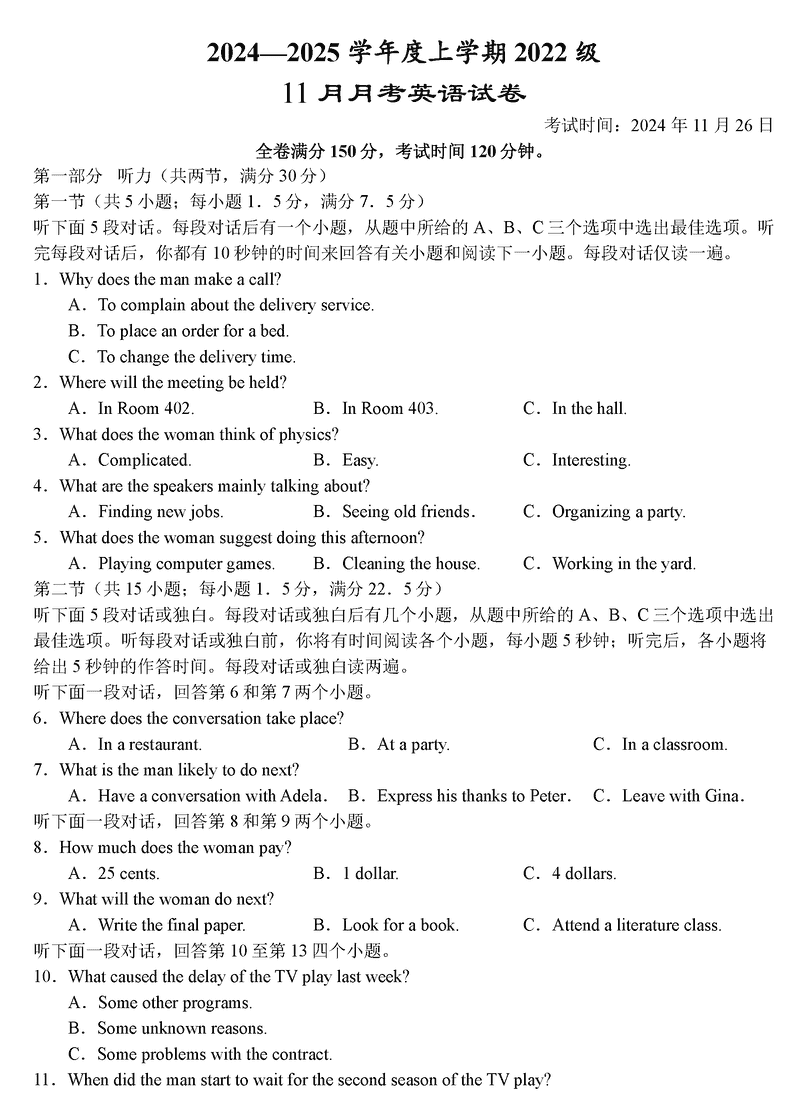 2025届湖北沙市中学高三11月月考英语考试已于近日开考,为方便考生考后及时查看考试情况,查漏补缺、弥补不足,本文整理了试题答案解析相关信息!