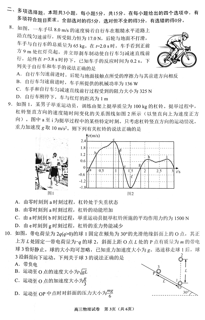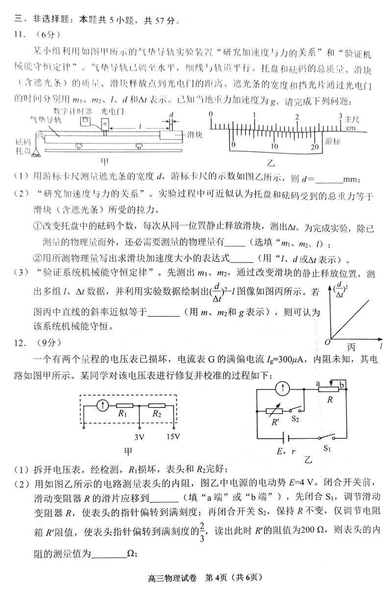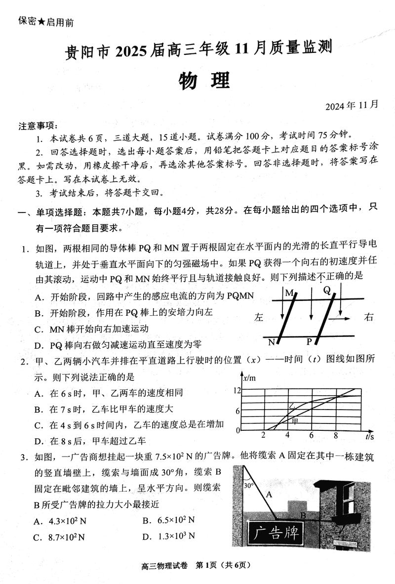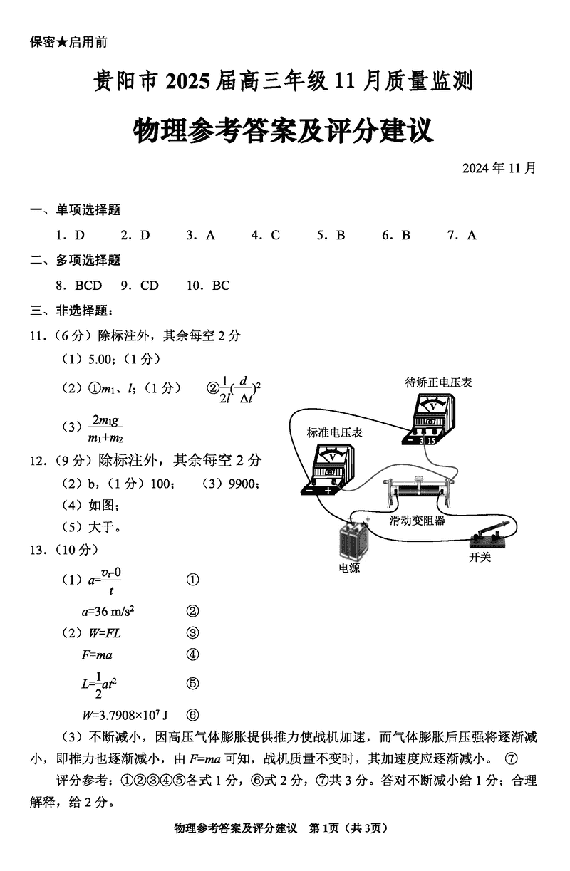 贵阳市2025届高三上学期11月质量监测物理试题及答案