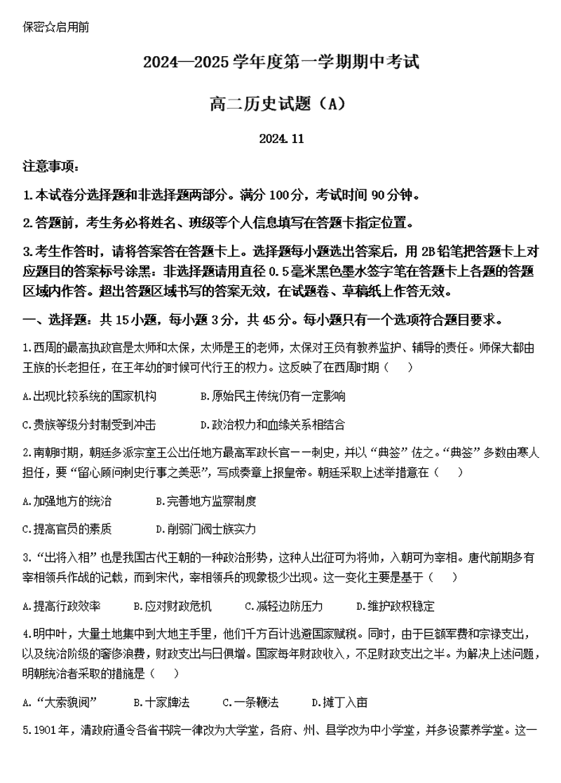 山东菏泽2024-2025学年高二上学期期中历史试题及答案