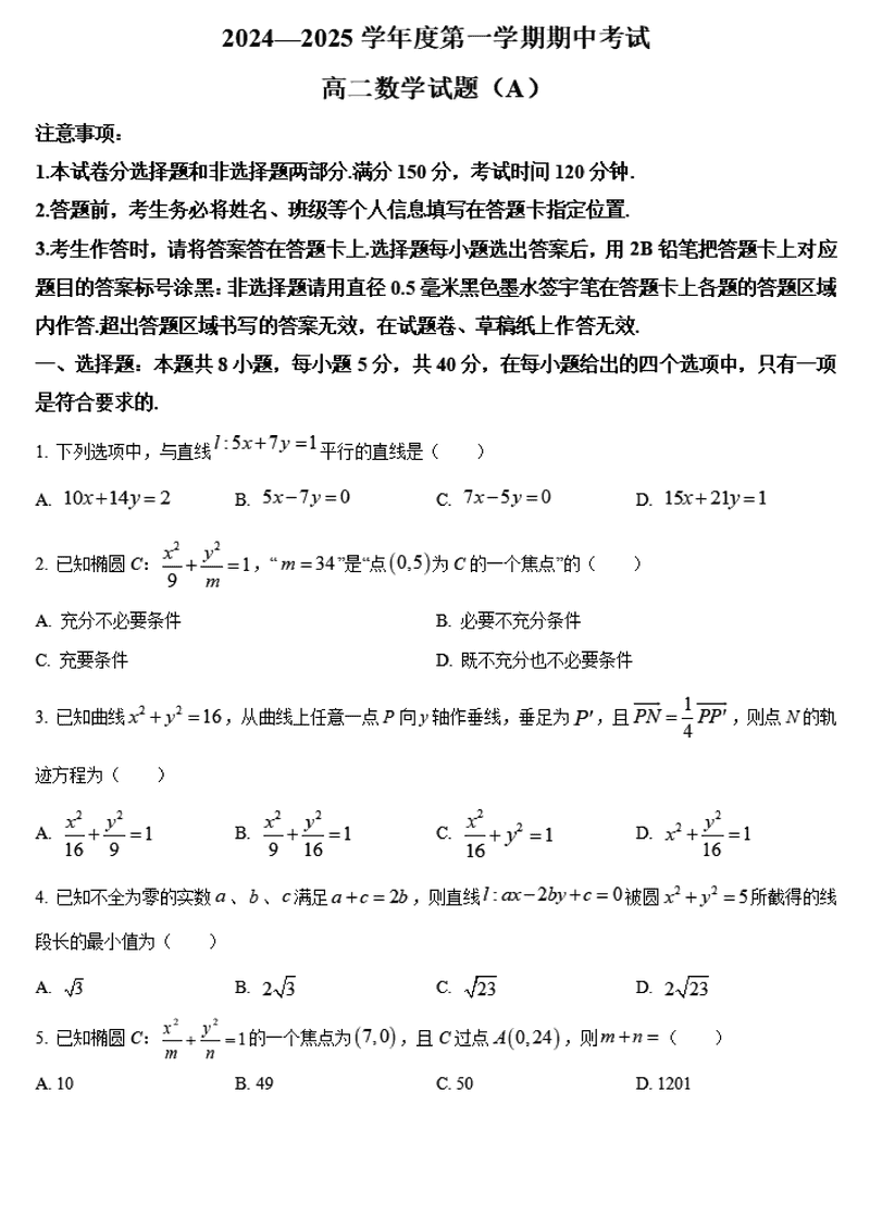 山东菏泽2024-2025学年高二上学期期中数学试题及答案