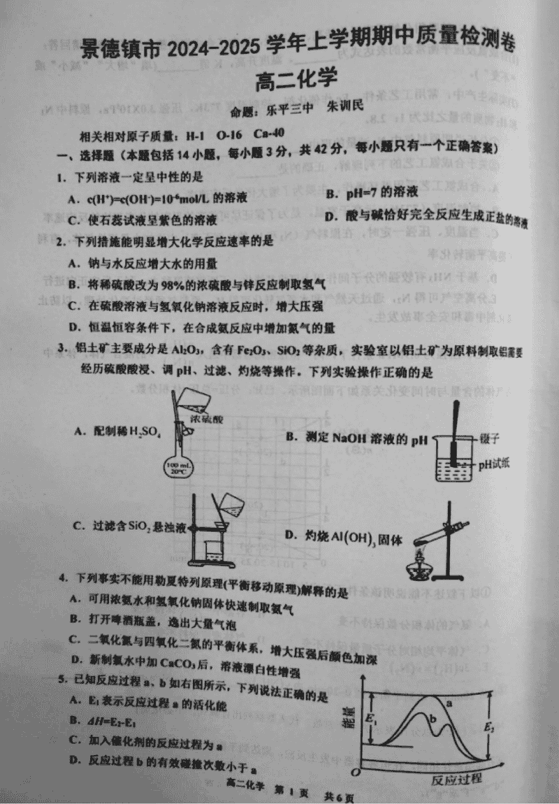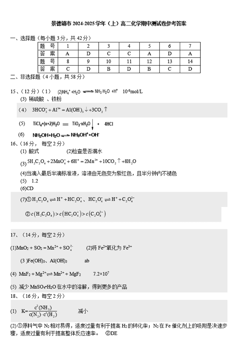 景德镇市2024-2025学年高二上学期11月期中化学试题及答案