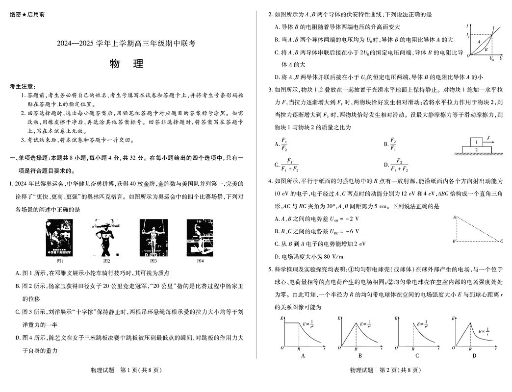 安徽卓越县中联盟2025届高三11月期中物理试题及答案
