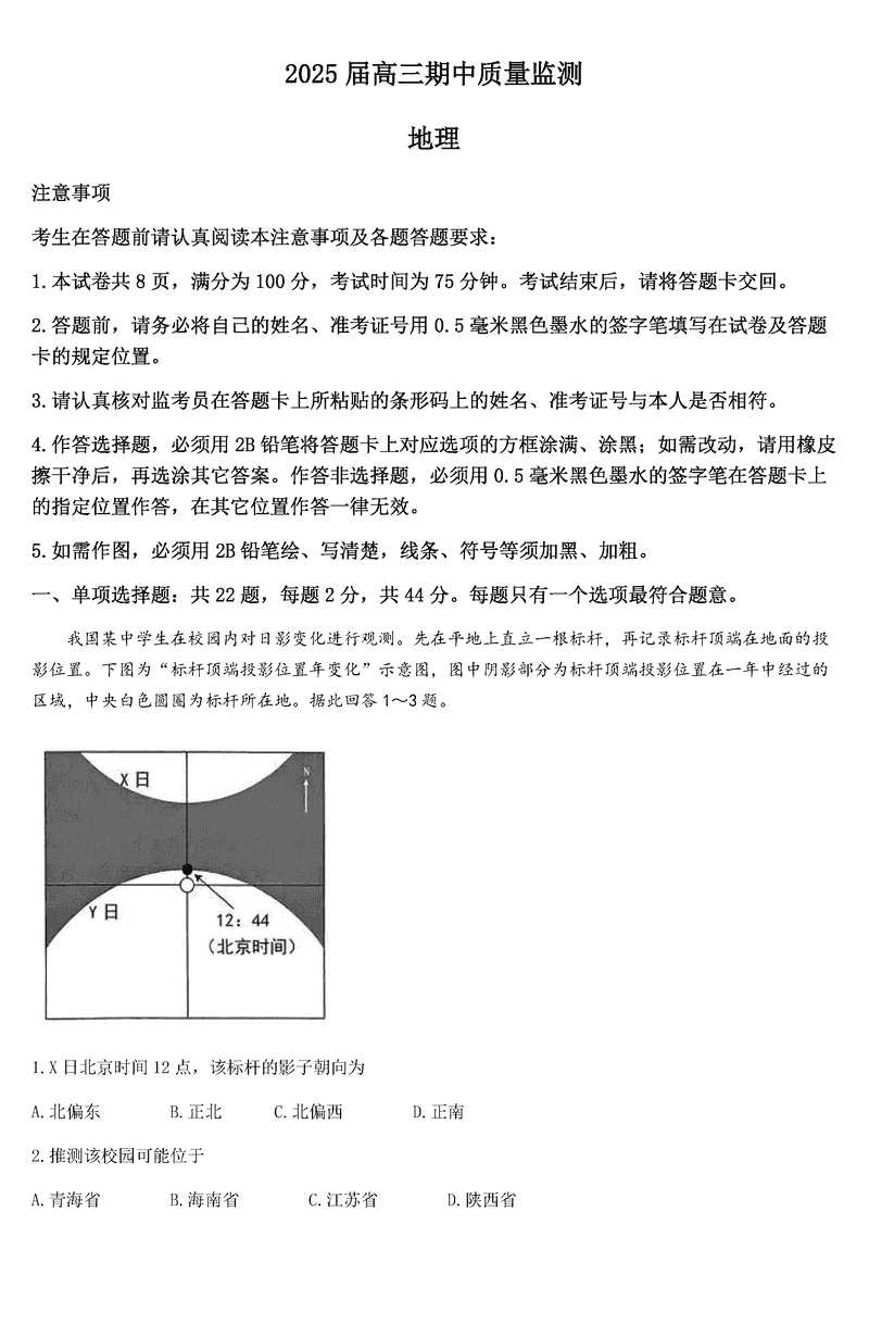 南通通州区、如东县2025届高三上学期期中联考地理试题及答案