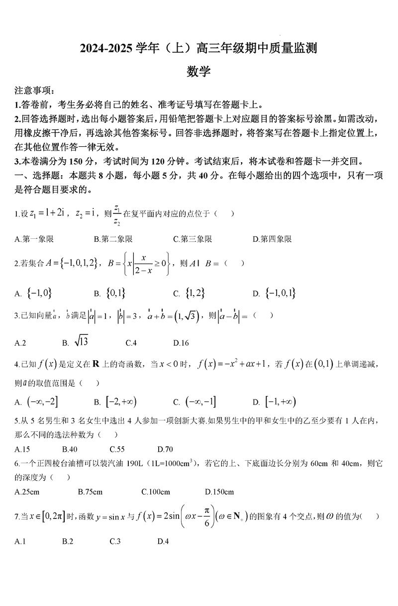 南通通州区、如东县2025届高三上学期期中联考数学试题及答案