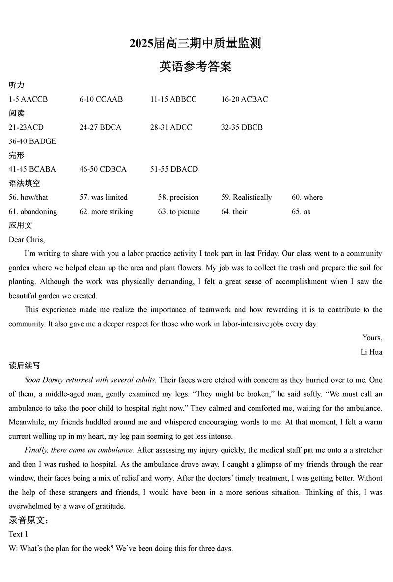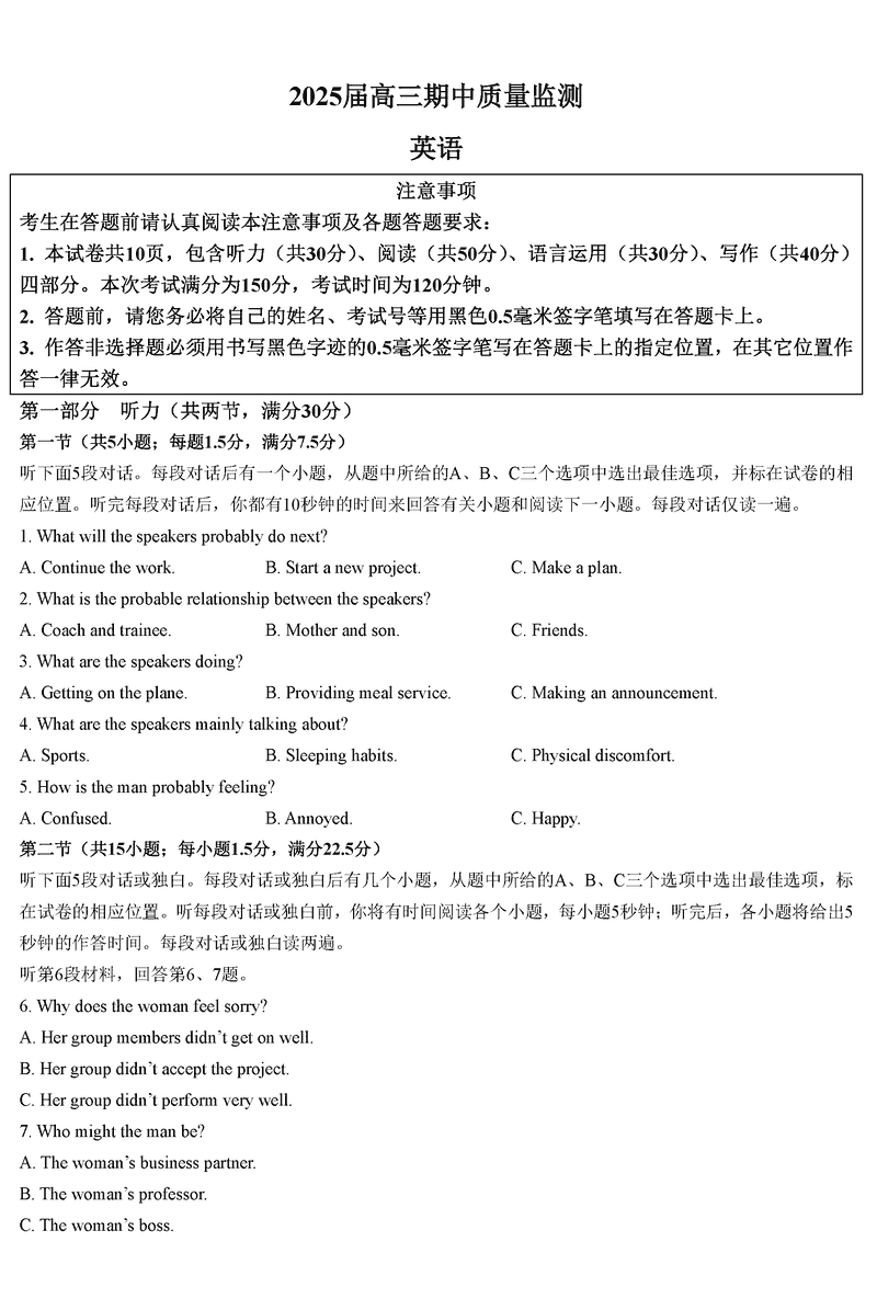 南通通州区、如东县2025届高三上学期期中联考英语试题及答案