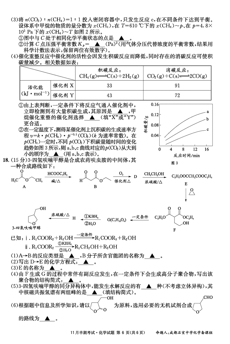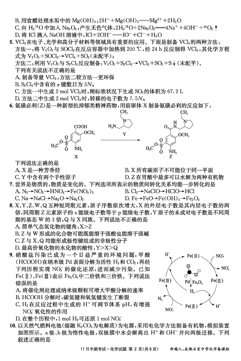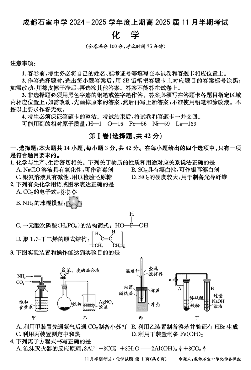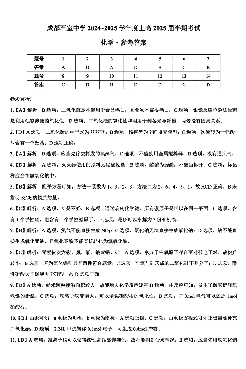 成都石室中学2025届高三11月期中化学考试已于近日开考,为方便考生考后及时查看考试情况,查漏补缺、弥补不足,本文整理了试题答案解析相关信息!