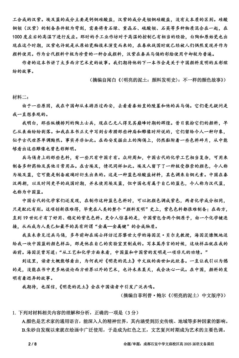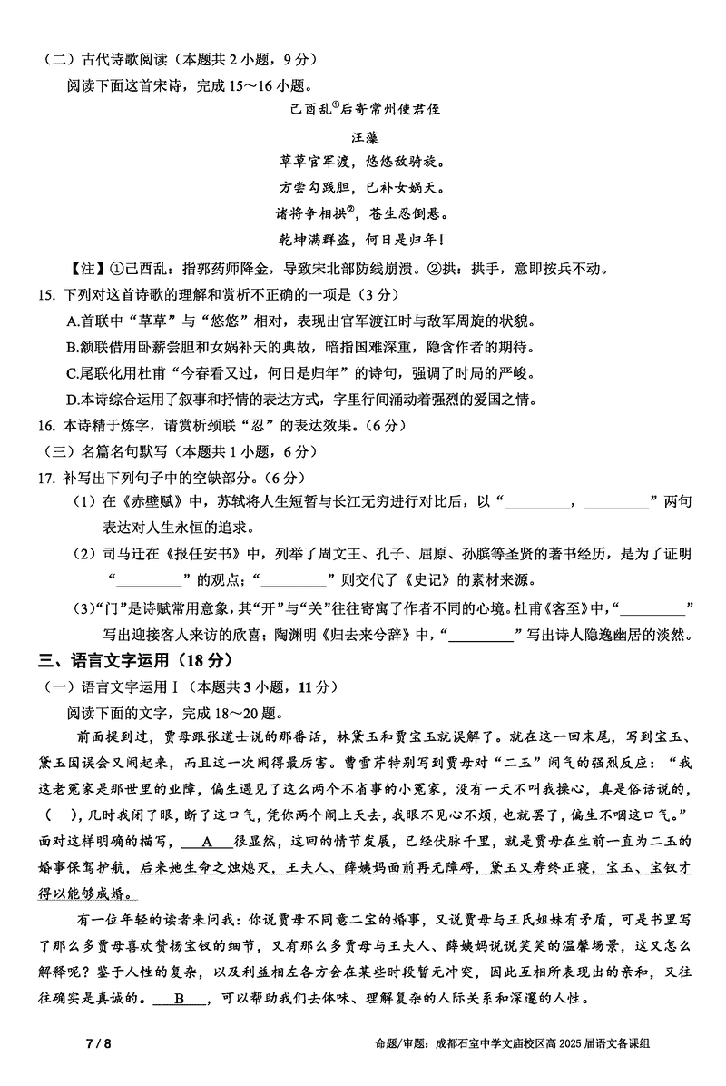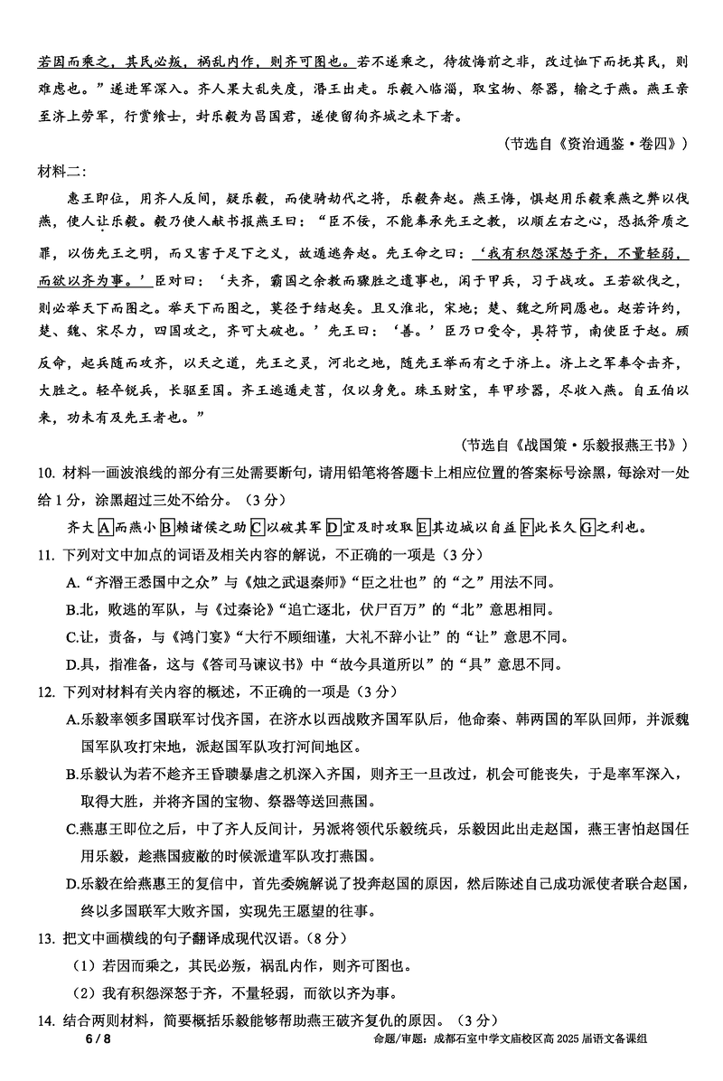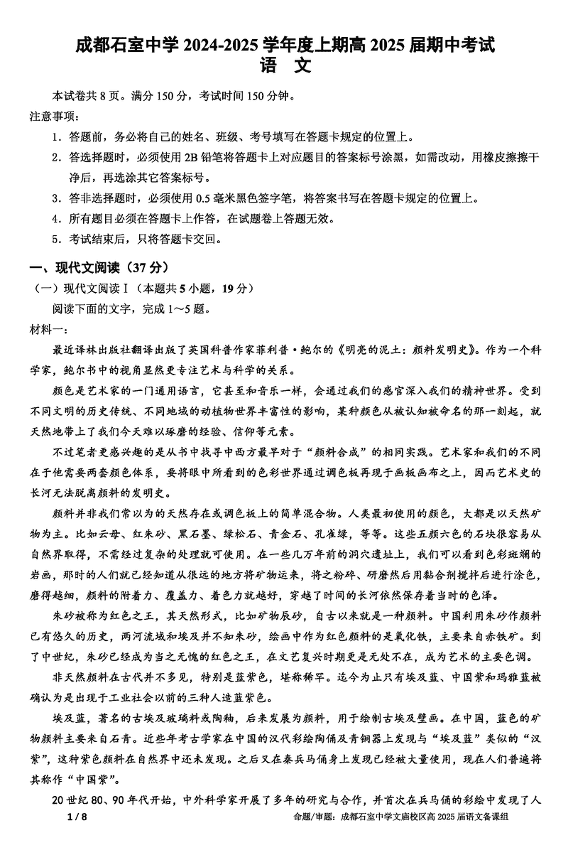 成都石室中学2025届高三11月期中语文考试已于近日开考,为方便考生考后及时查看考试情况,查漏补缺、弥补不足,本文整理了试题答案解析相关信息!