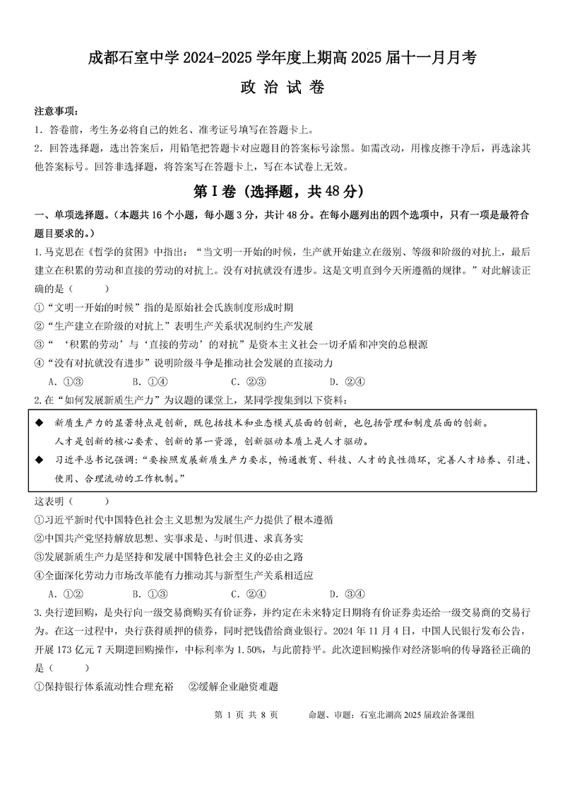 汇总:成都石室中学2025届高三11月期中考试试题及答案汇总