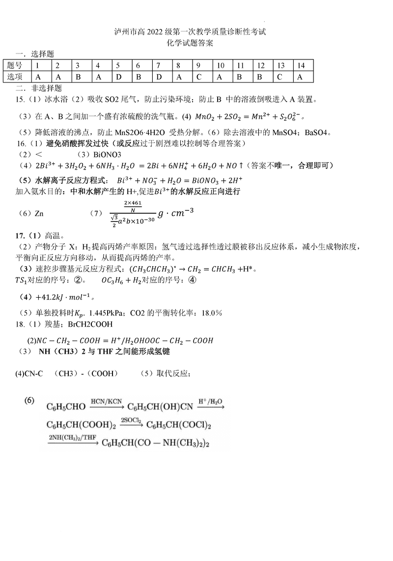 泸州一诊高2025届第一次教学质量诊断化学试题及答案