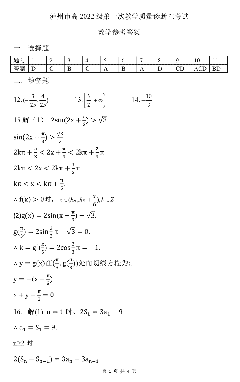 泸州一诊高2025届第一次教学质量诊断数学试题及答案
