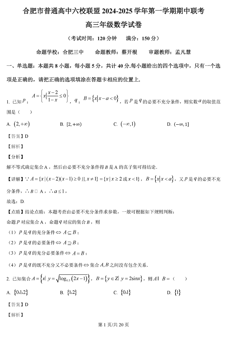 合肥六校联盟2025届高三上学期期中联考数学考试已于近日开考,为方便考生考后及时查看考试情况,查漏补缺、弥补不足,本文整理了试题答案解析相关信息!