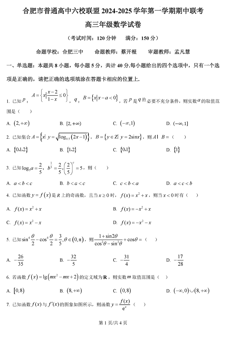 合肥六校联盟2025届高三上学期期中联考数学试题及答案