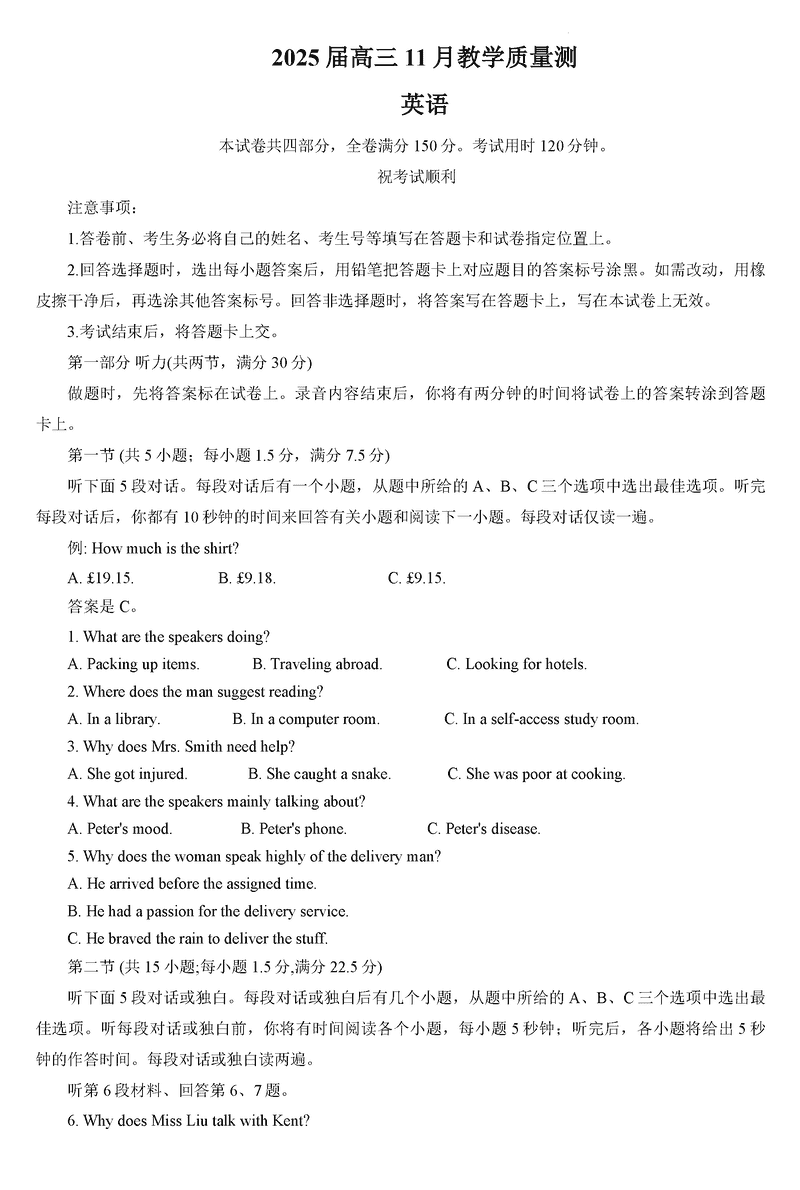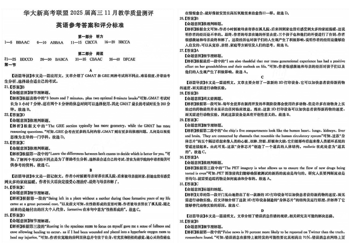 华大新高考联盟2025届高三11月教学质量测评英语考试已于近日开考,为方便考生考后及时查看考试情况,查漏补缺、弥补不足,本文整理了试题答案解析相关信息!