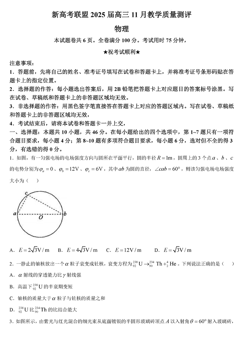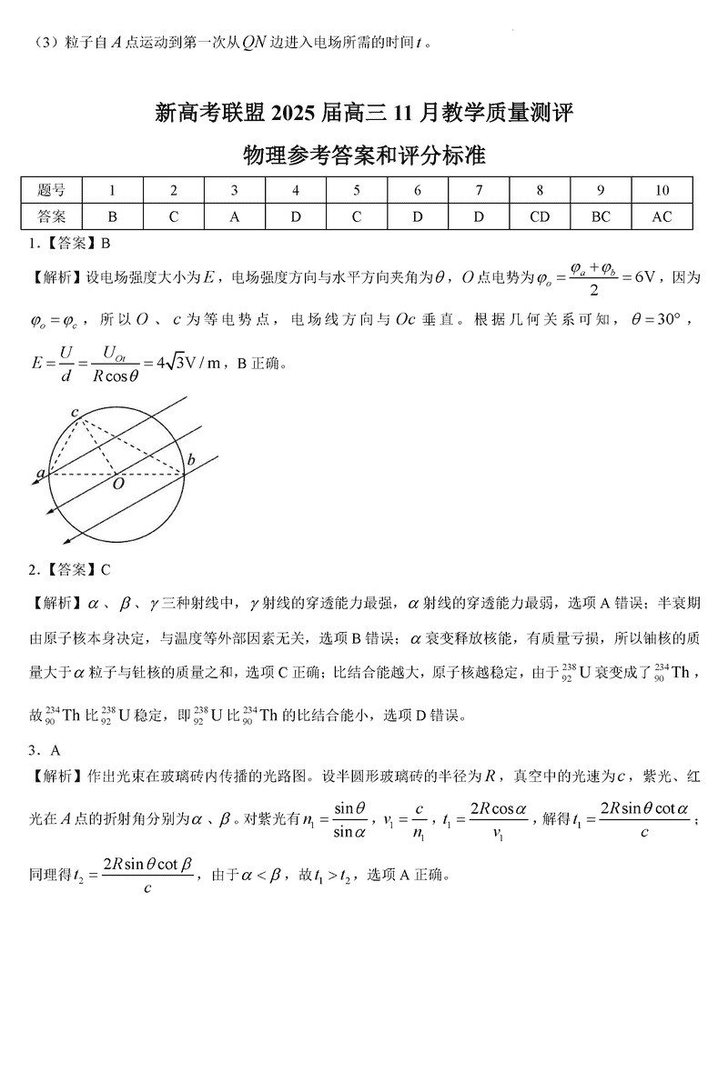 华大新高考联盟2025届高三11月教学质量测评物理试题及答案