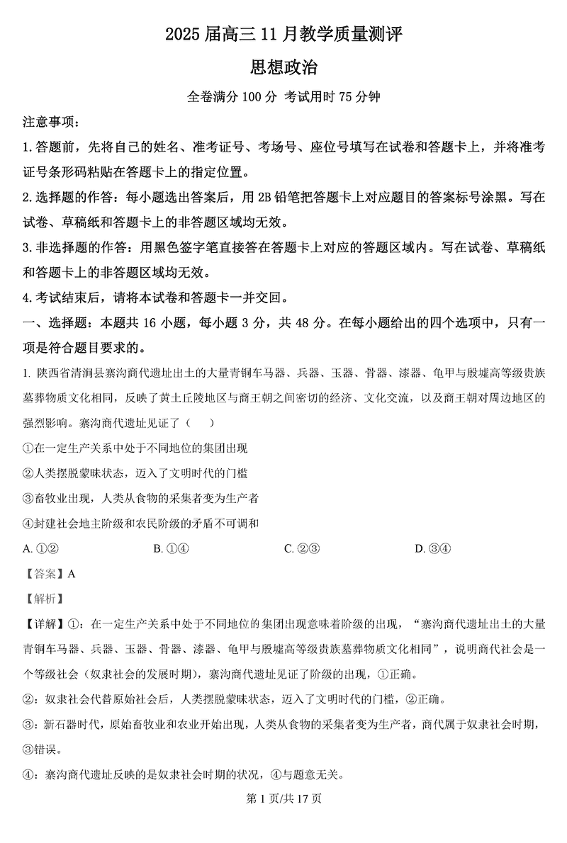 华大新高考联盟2025届高三11月教学质量测评政治试题及答案