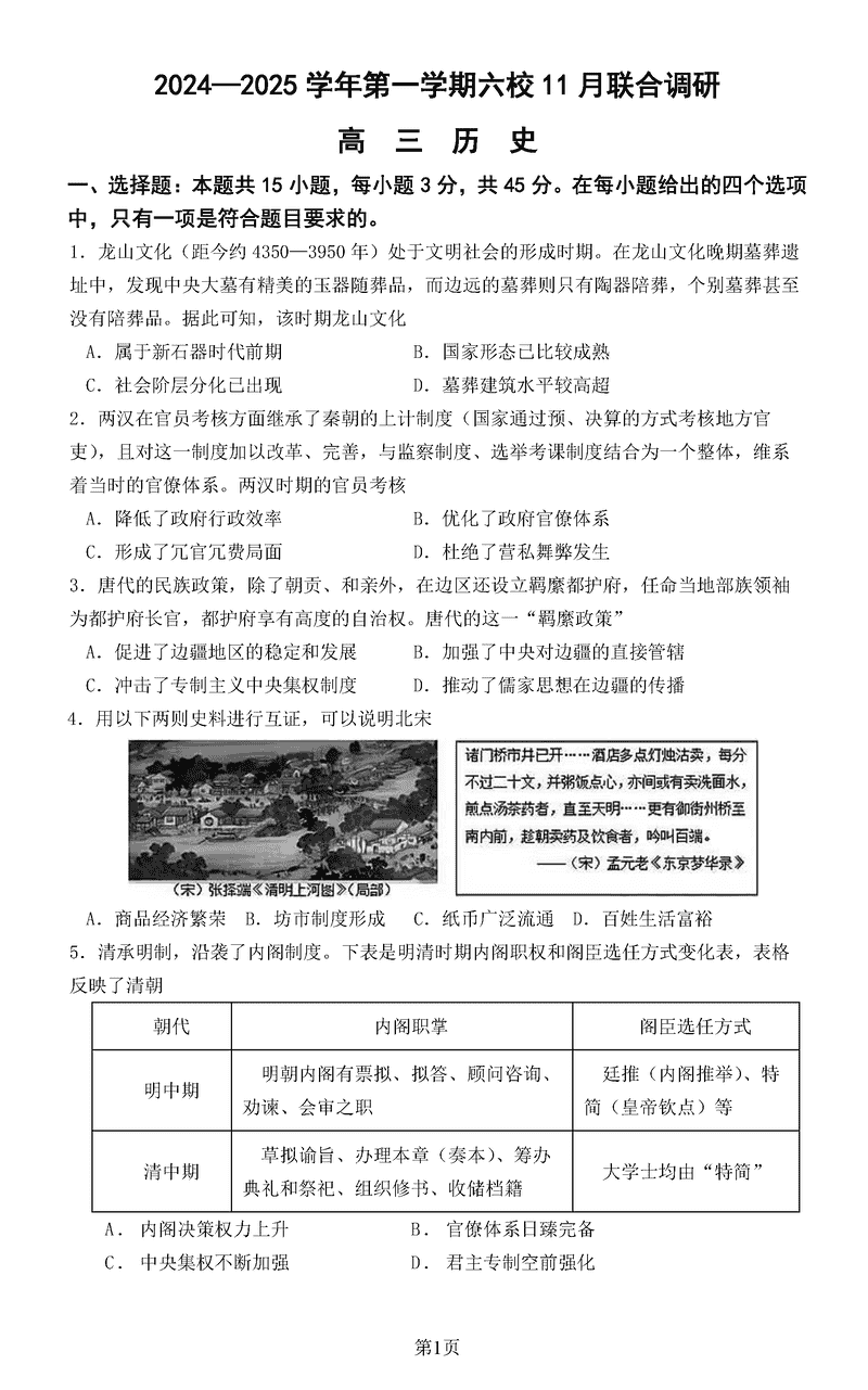 南京六校联合体2025届高三上学期11月联考历史试题及答案