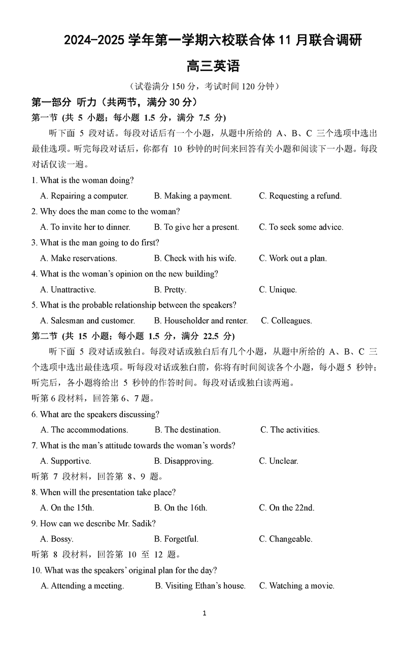 南京六校联合体2025届高三上学期11月联考英语试题及答案