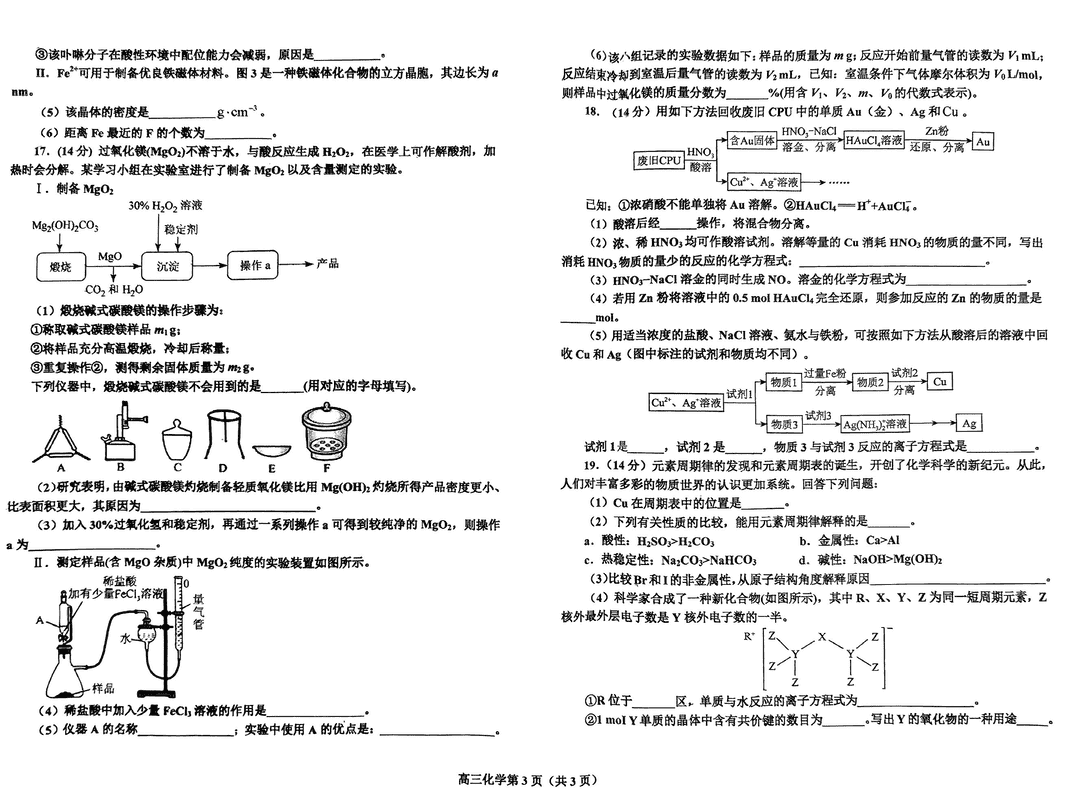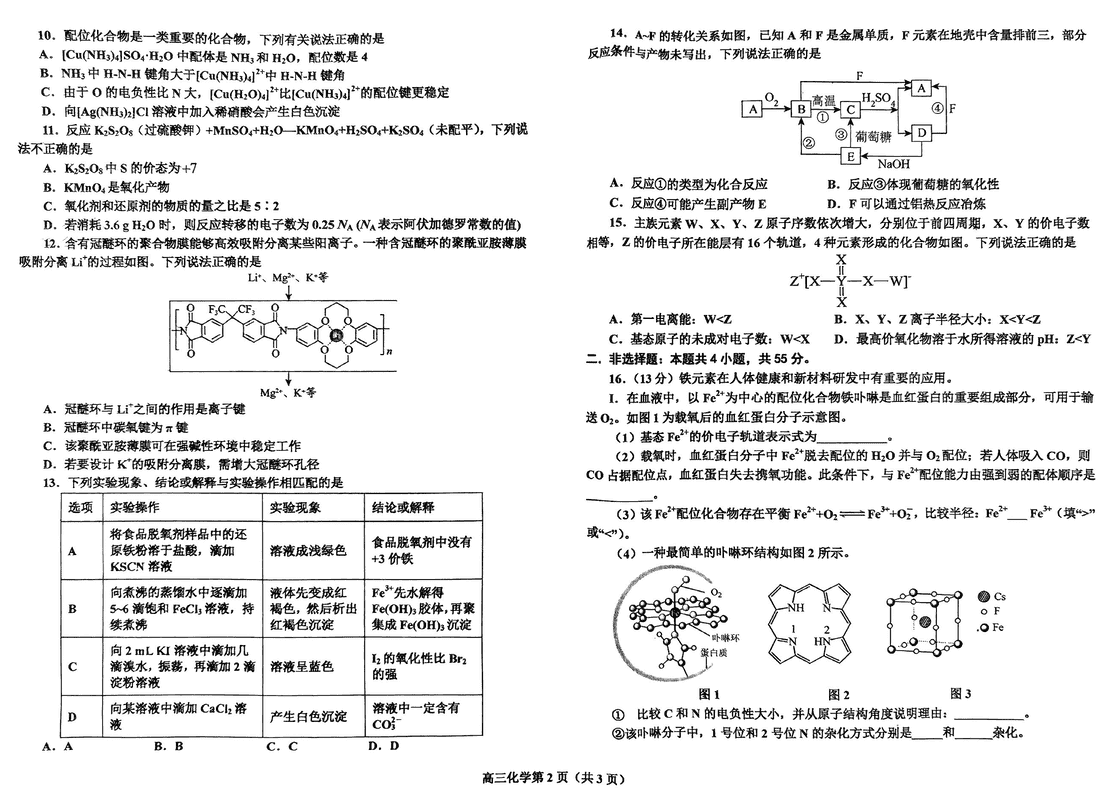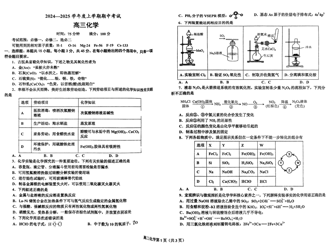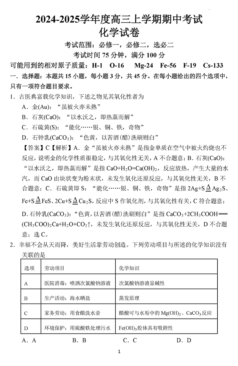 鞍山市重点高中协作校2025届高三上学期期中化学试题及答案