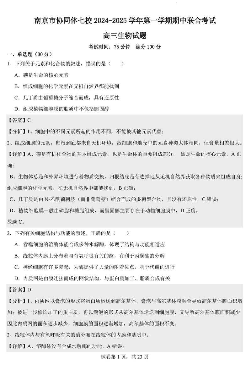 南京协同体七校2025届高三期中联考生物试题及答案 时间:2024-12-02 17:30 江苏 理综试题 南京协同体七校2025届高三期中联考生物考试已于近日开考,为方便考生考后及时查看考试情况,查漏补缺、弥补不足,本文整理了试题答案解析相关信息! 汇总:南京协同体七校2025届高三期中联考试题及答案汇总 生物试题及答案解析