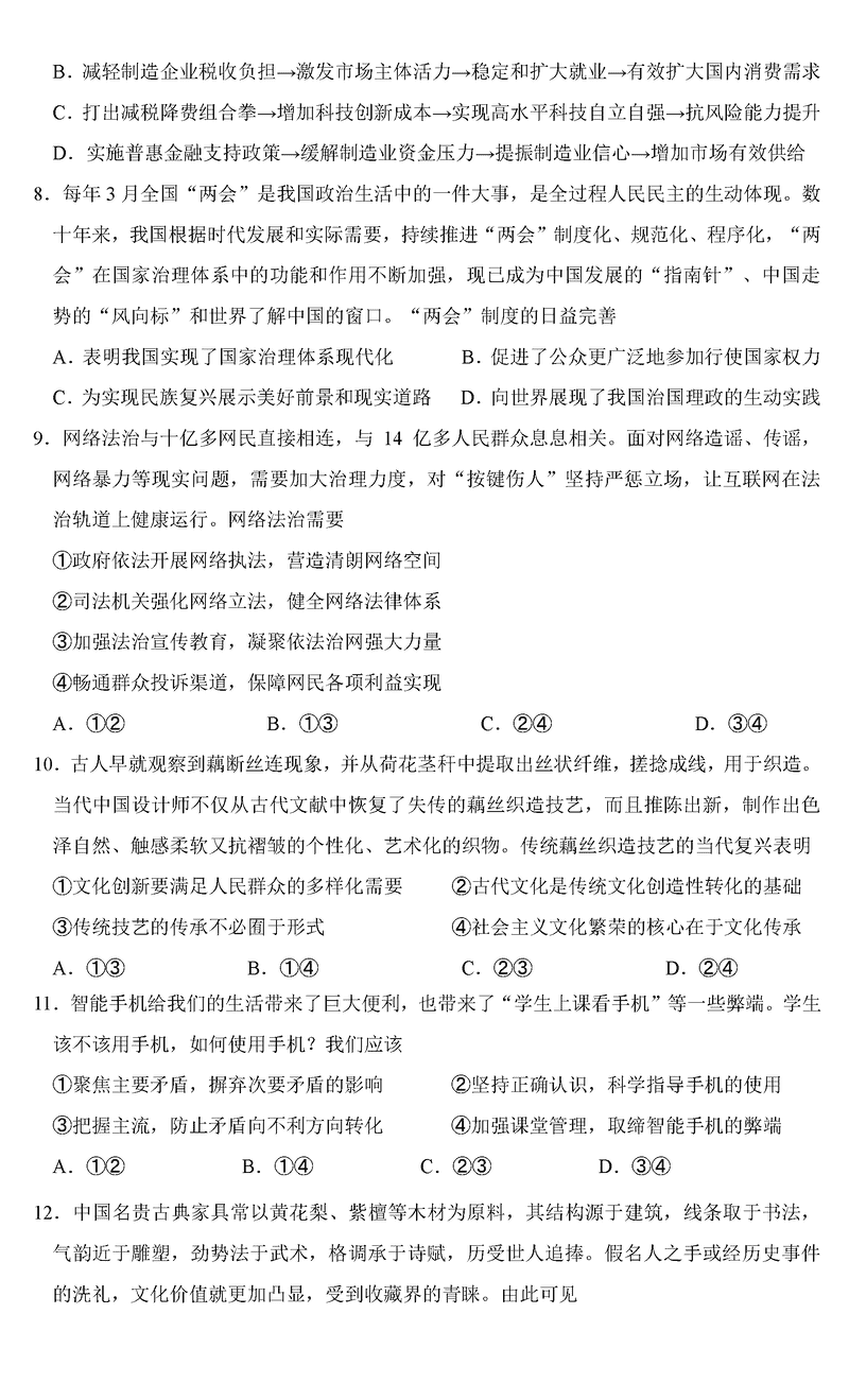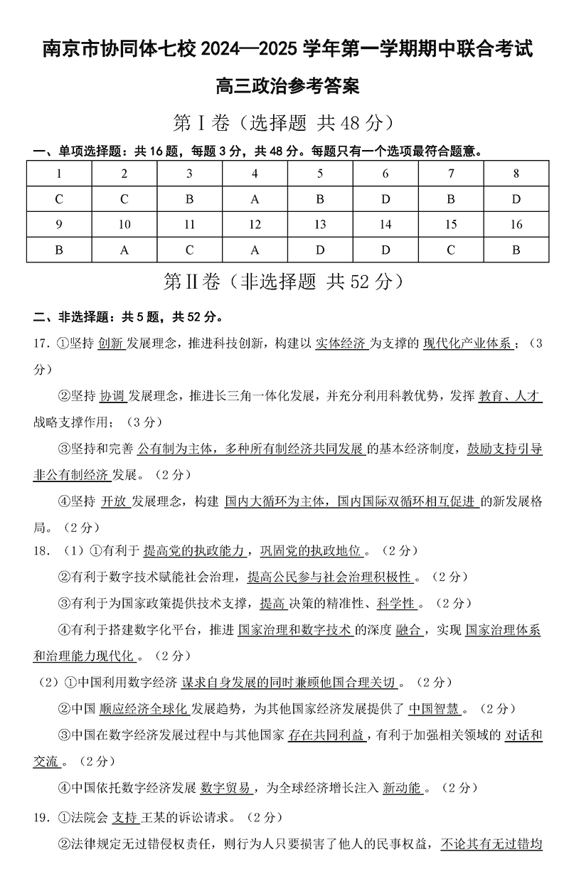 南京协同体七校2025届高三期中联考政治试题及答案 时间:2024-12-02 17:34 江苏 文综试题 南京协同体七校2025届高三期中联考政治考试已于近日开考,为方便考生考后及时查看考试情况,查漏补缺、弥补不足,本文整理了试题答案解析相关信息! 汇总:南京协同体七校2025届高三期中联考试题及答案汇总 政治试题及答案解析