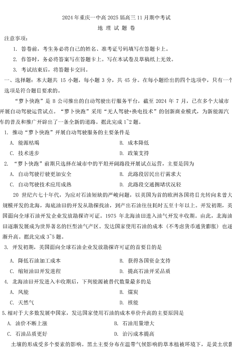重庆一中2025届高三上学期11月期中地理试题及答案