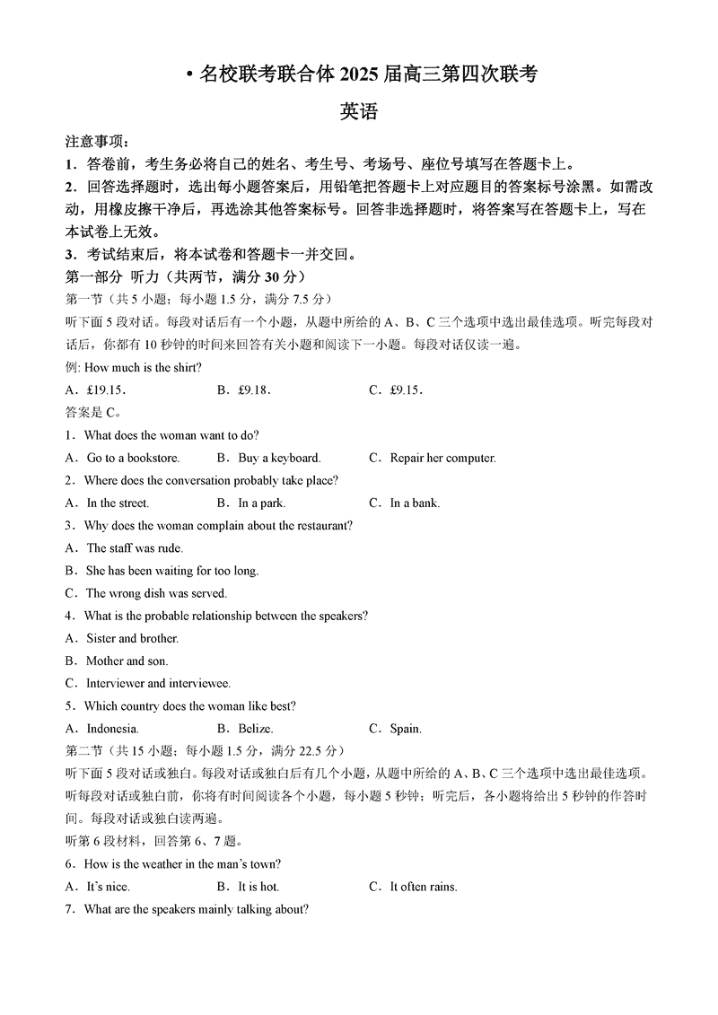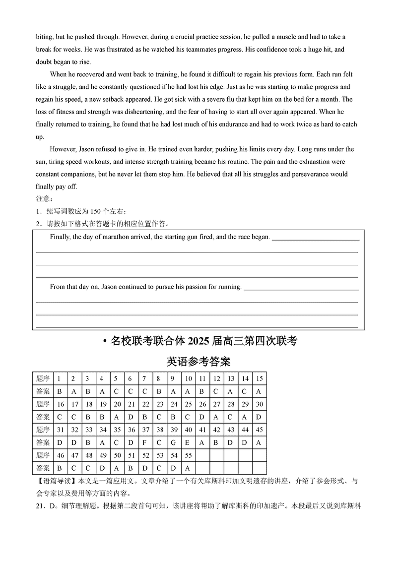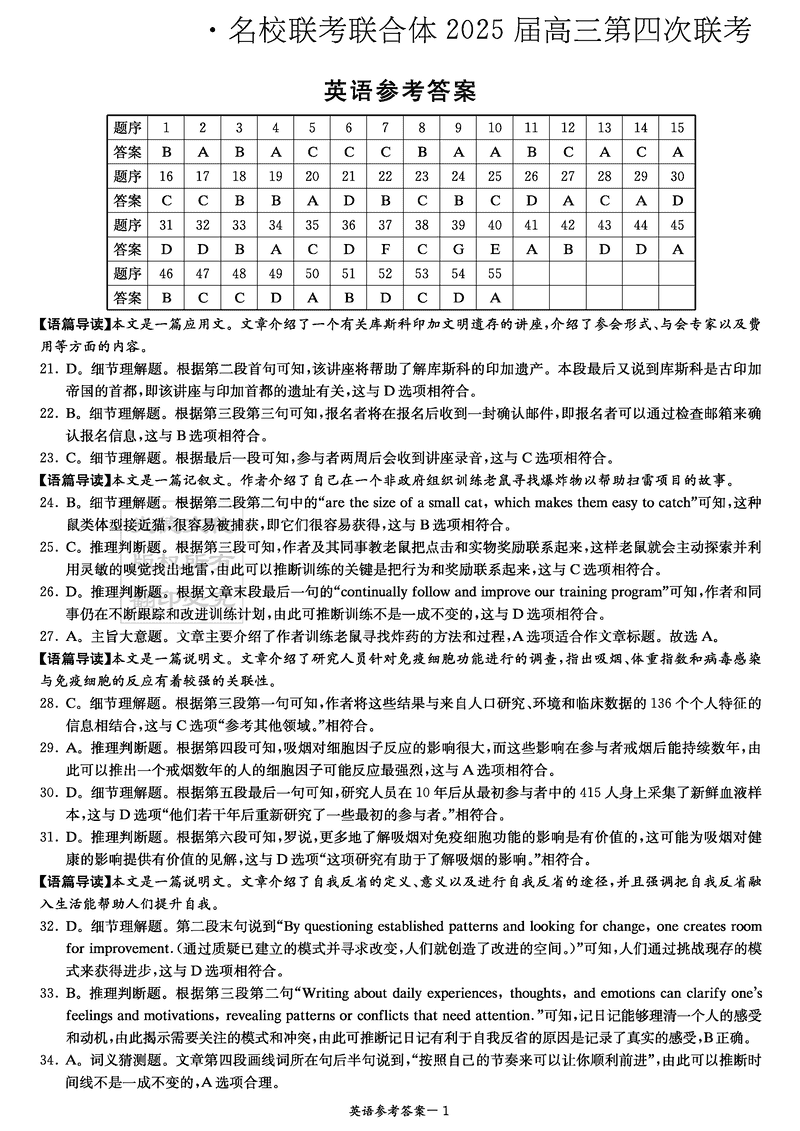 湖南名校联考联合体2025届高三第四次联考英语考试已于近日开考,为方便考生考后及时查看考试情况,查漏补缺、弥补不足,本文整理了试题答案解析相关信息!