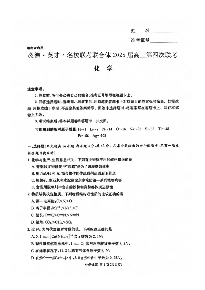 湖南名校联考联合体2025届高三第四次联考化学考试已于近日开考,为方便考生考后及时查看考试情况,查漏补缺、弥补不足,本文整理了试题答案解析相关信息!