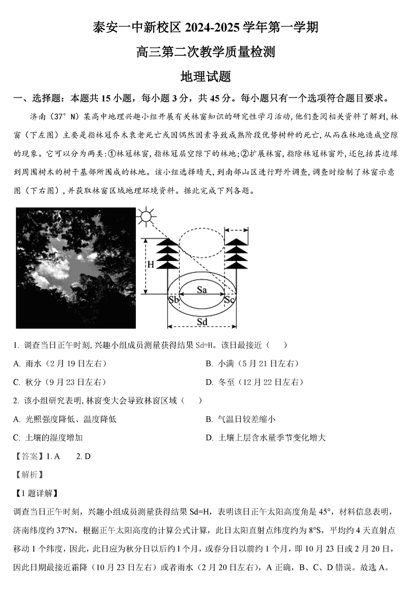 山东泰安一中2025届高三上第二次质检地理试题及答案