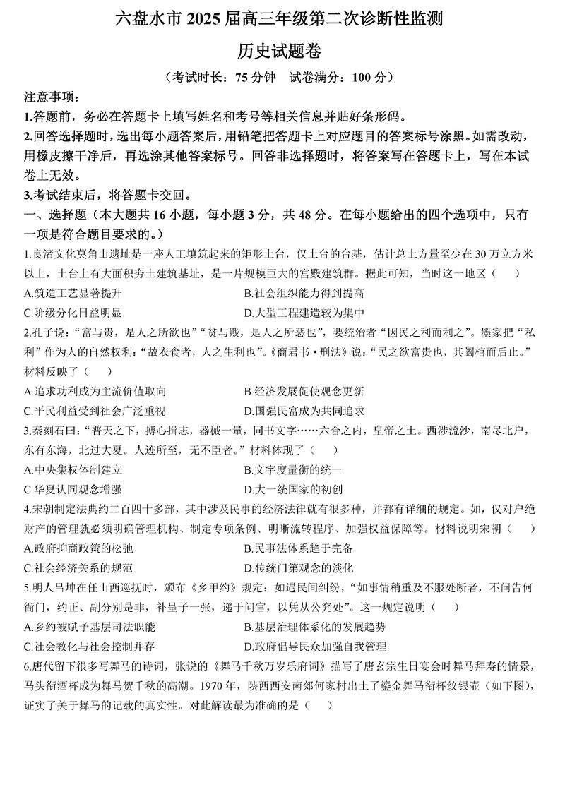 六盘水2025届高三上学期第二次诊断历史试题及答案