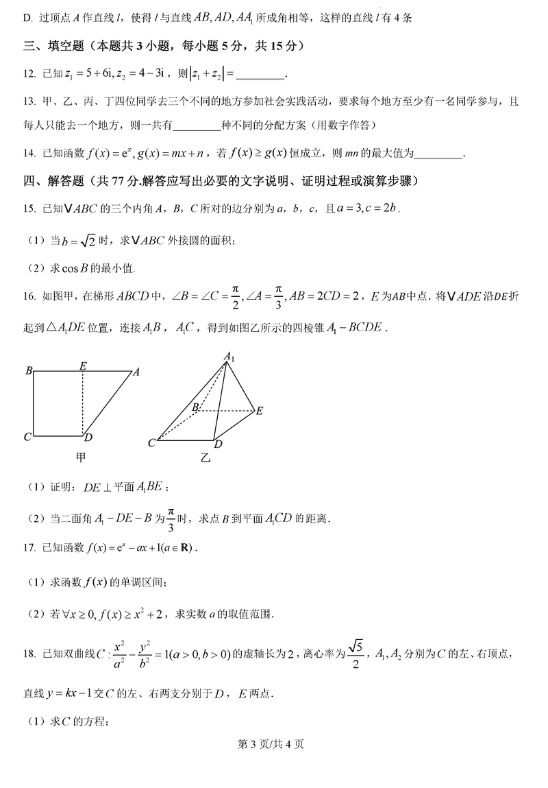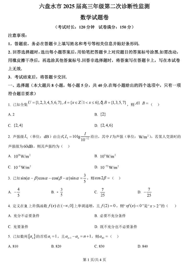 六盘水2025届高三上学期第二次诊断数学试题及答案
