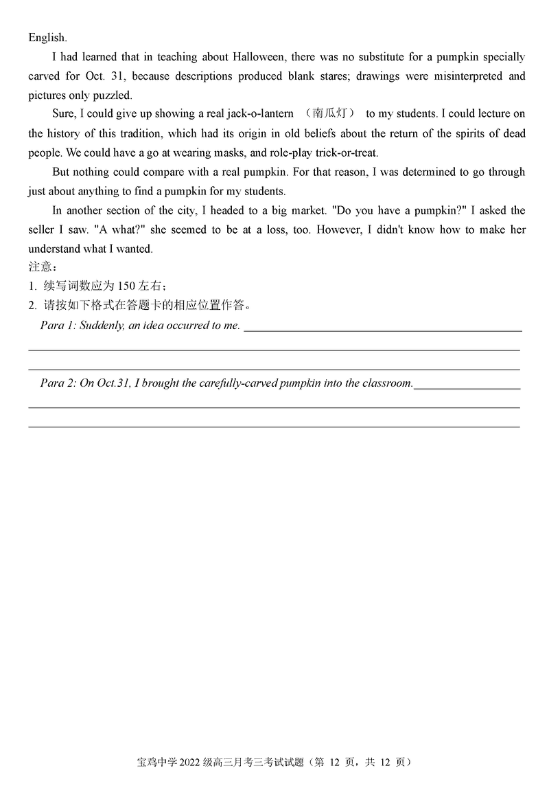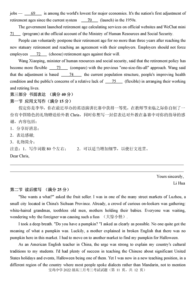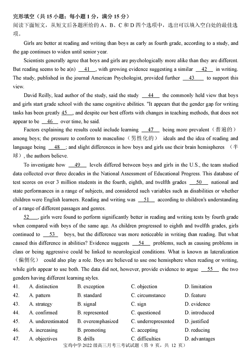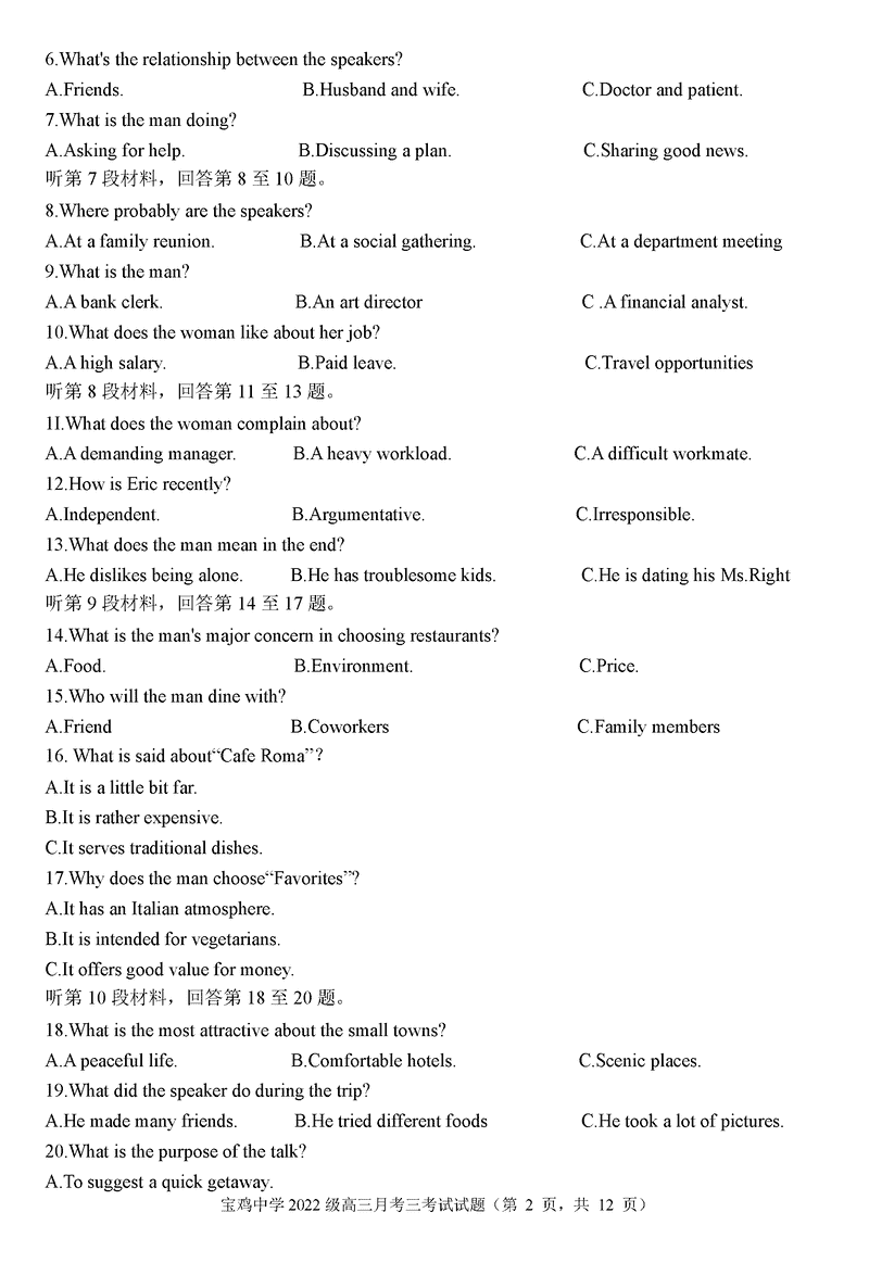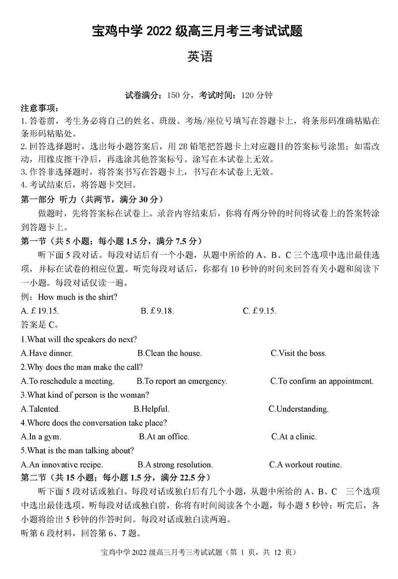 陕西宝鸡中学2025届高三12月月考三英语考试已于近日开考,为方便考生考后及时查看考试情况,查漏补缺、弥补不足,本文整理了试题答案解析相关信息!
