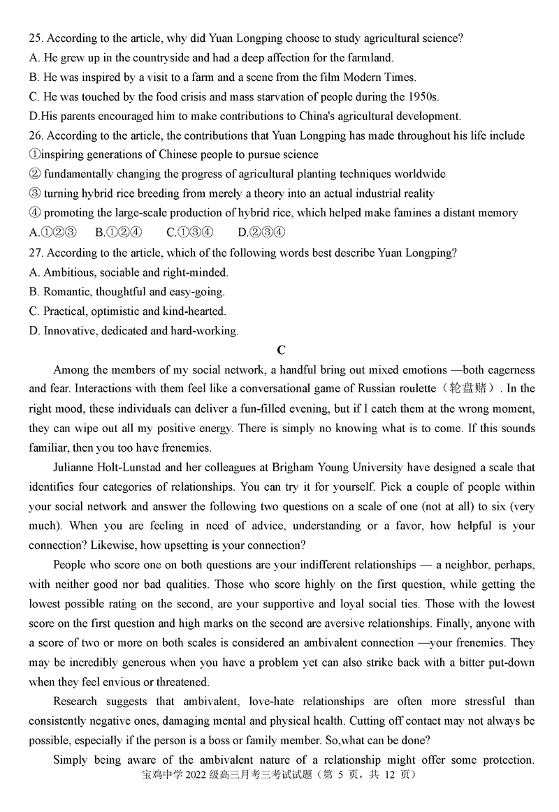 陕西宝鸡中学2025届高三12月月考三英语试题及答案