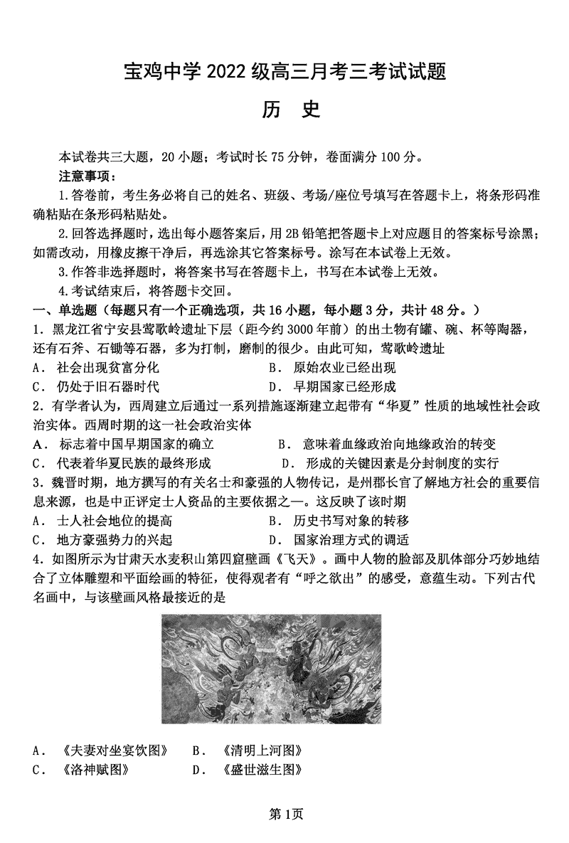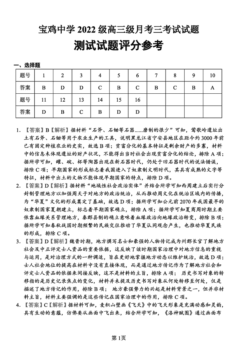 陕西宝鸡中学2025届高三12月月考三历史考试已于近日开考,为方便考生考后及时查看考试情况,查漏补缺、弥补不足,本文整理了试题答案解析相关信息!