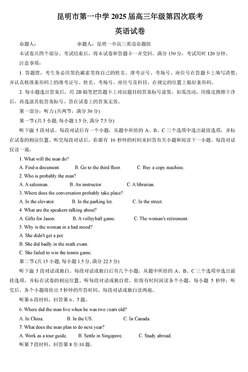 云南昆明一中2025届高三第四次联考英语试题及答案 时间:2024-12-04 21:39 云南 英语试题 云南昆明一中2025届高三第四次联考英语考试已于近日开考,为方便考生考后及时查看考试情况,查漏补缺、弥补不足,本文整理了试题答案解析相关信息! 汇总:云南昆明一中2025届高三第四次联考试题及答案汇总 英语试题及答案解析