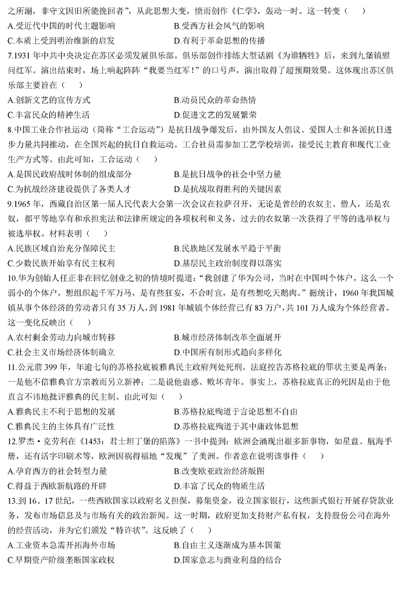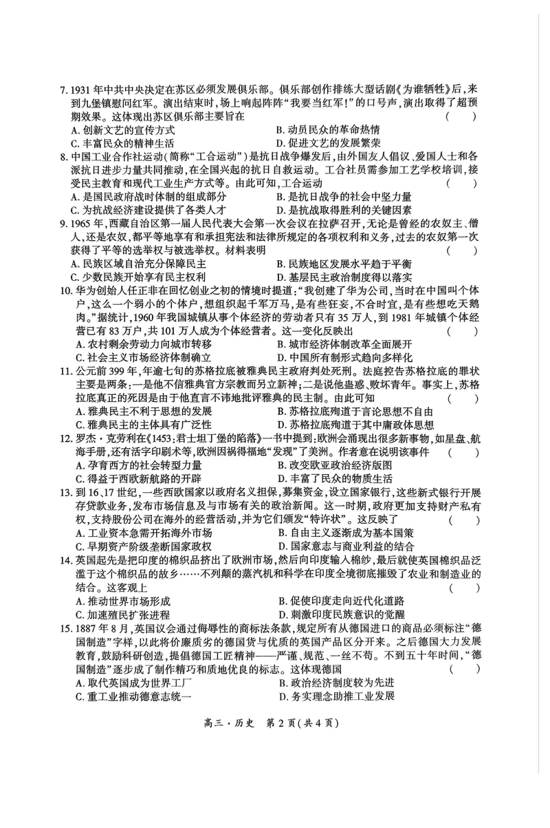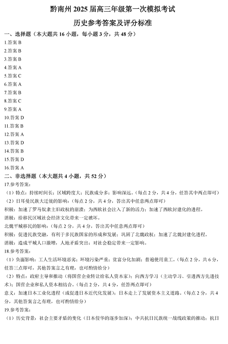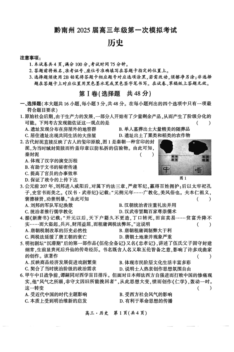 贵州黔南州025届高三第一次模考历史试题及答案 时间:2024-12-04 21:50 贵州 文综试题 贵州黔南州025届高三第一次模考历史考试已于近日开考,为方便考生考后及时查看考试情况,查漏补缺、弥补不足,本文整理了试题答案解析相关信息! 汇总:贵州黔南025届高三第一次模考试题及答案汇总 历史试题及答案解析