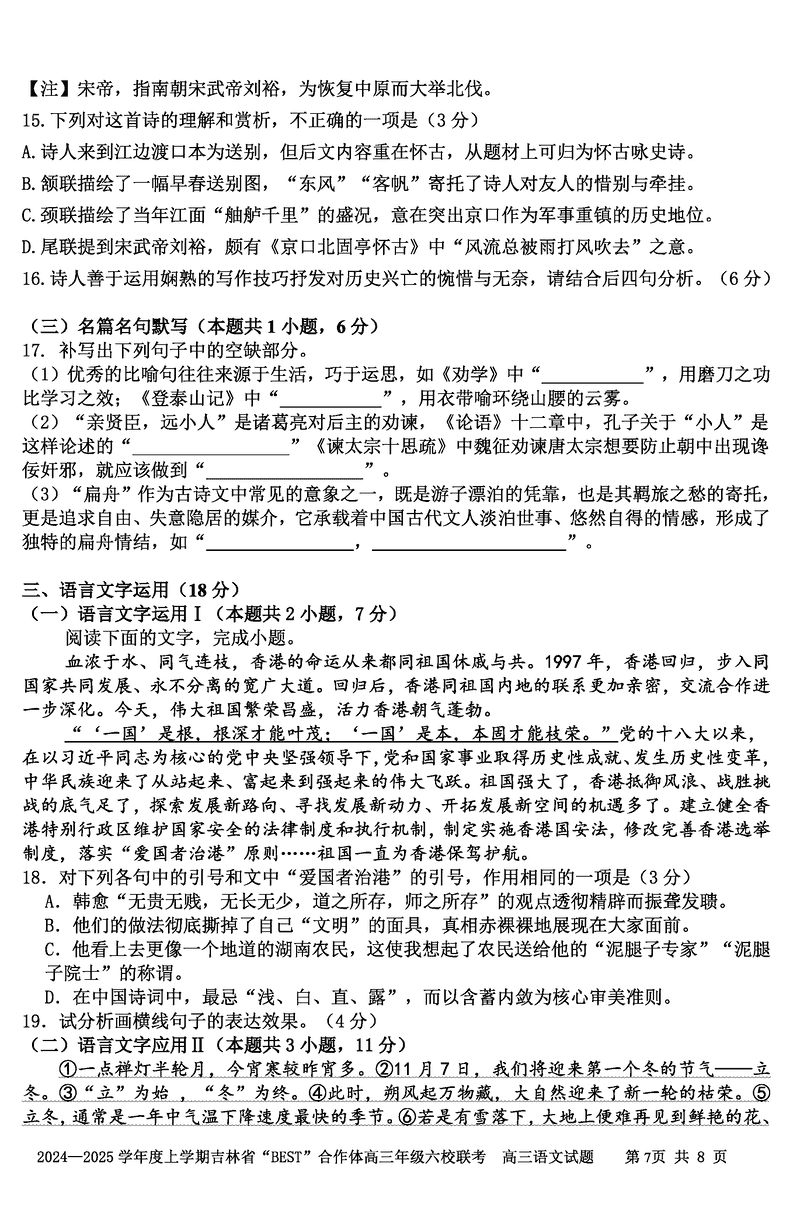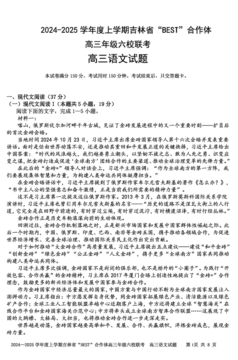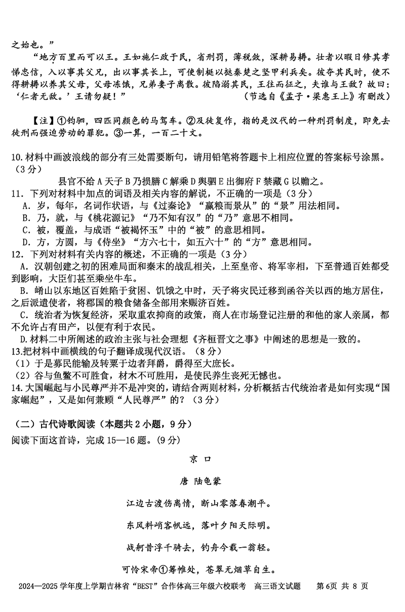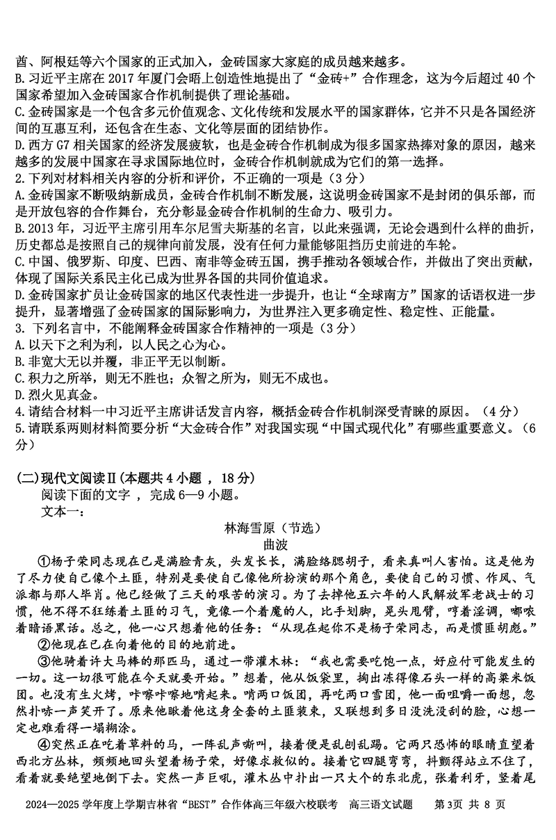 吉林BEST合作体六校2025届高三上学期第三次联考语文试题及答案