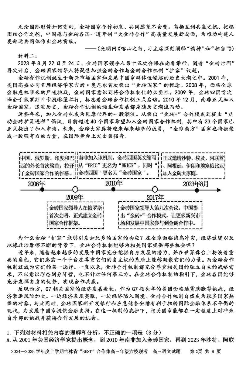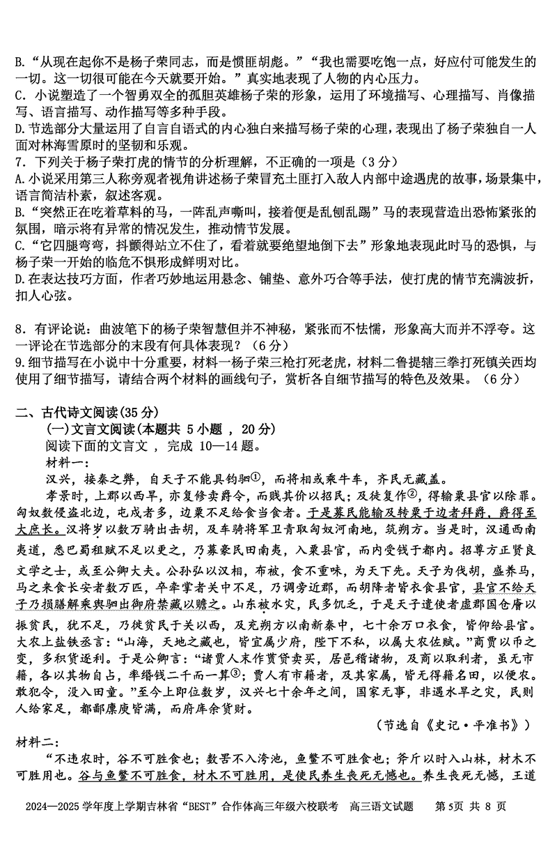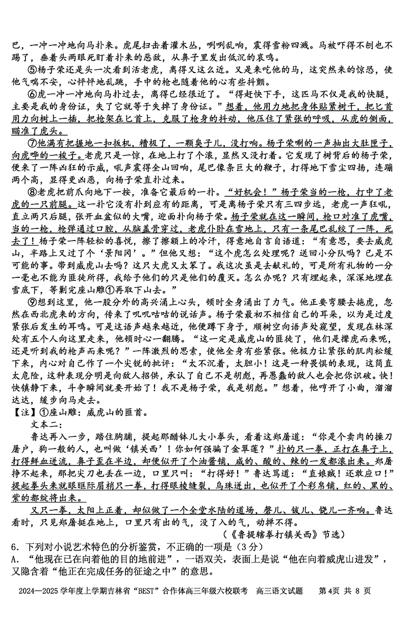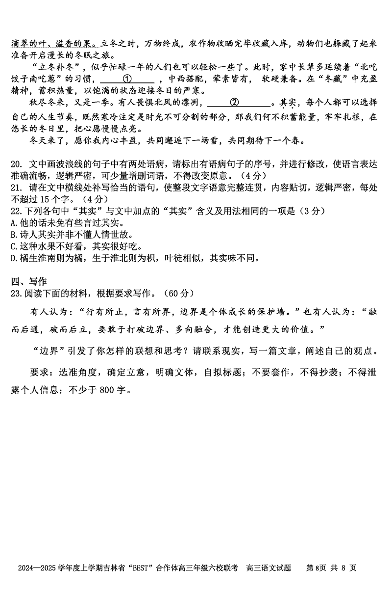 吉林BEST合作体六校2025届高三上学期第三次联考语文试题及答案