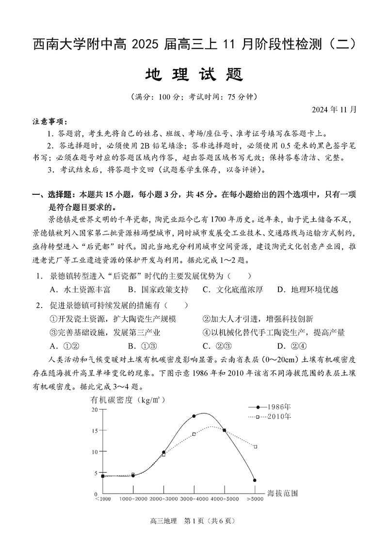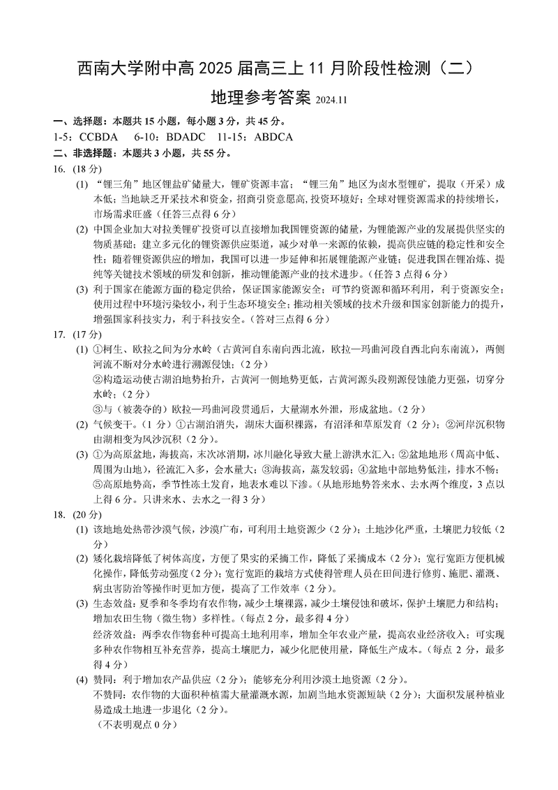 重庆西南大学附中2025届高三上学期11月阶段性检测(二)地理考试已于近日开考,为方便考生考后及时查看考试情况,查漏补缺、弥补不足,本文整理了试题答案解析相关信息!
