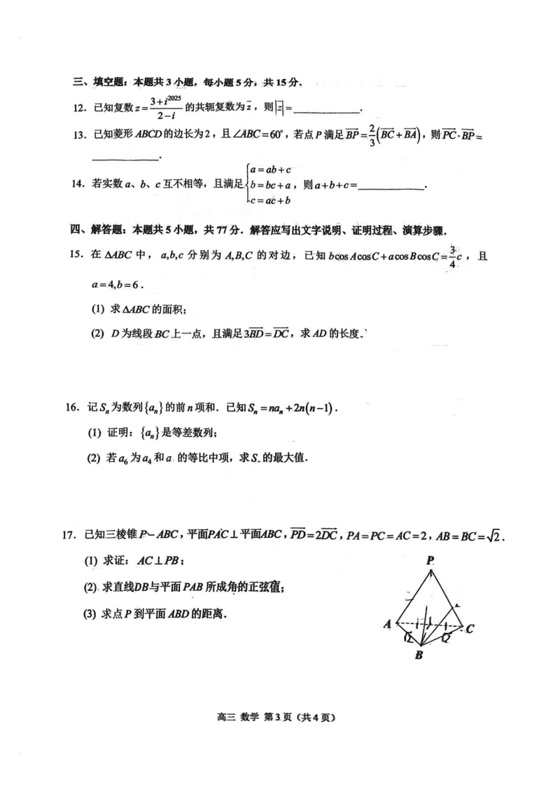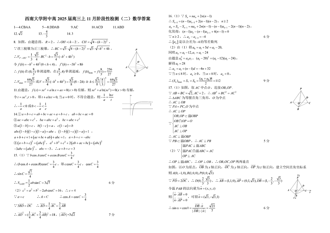 重庆西南大学附中2025届高三上学期11月阶段性检测(二)数学试题及答案