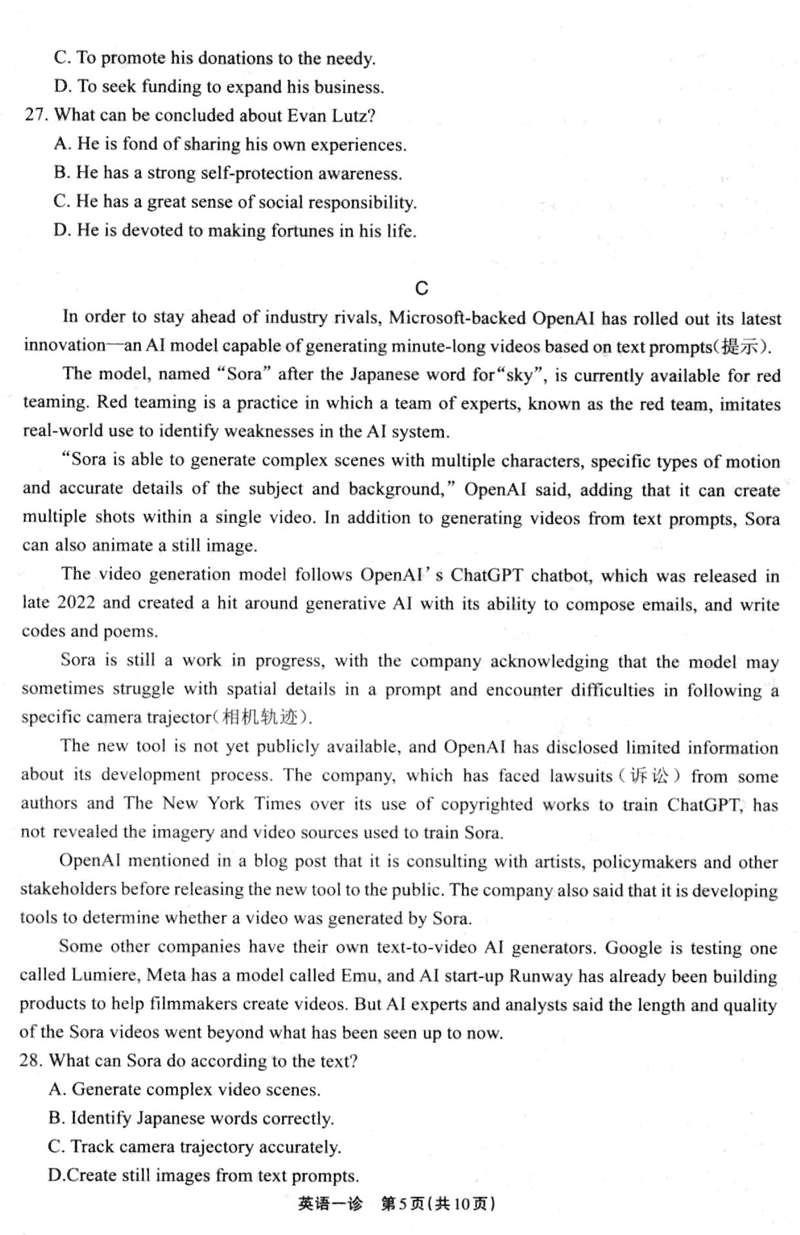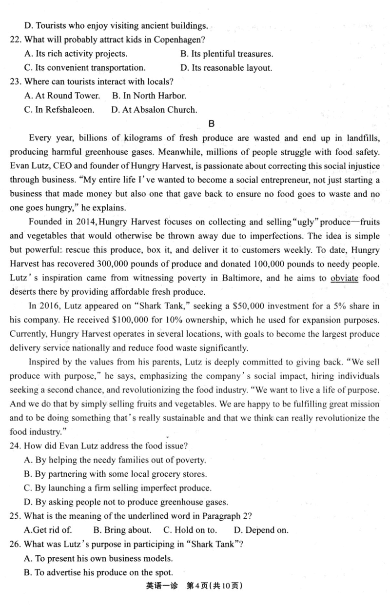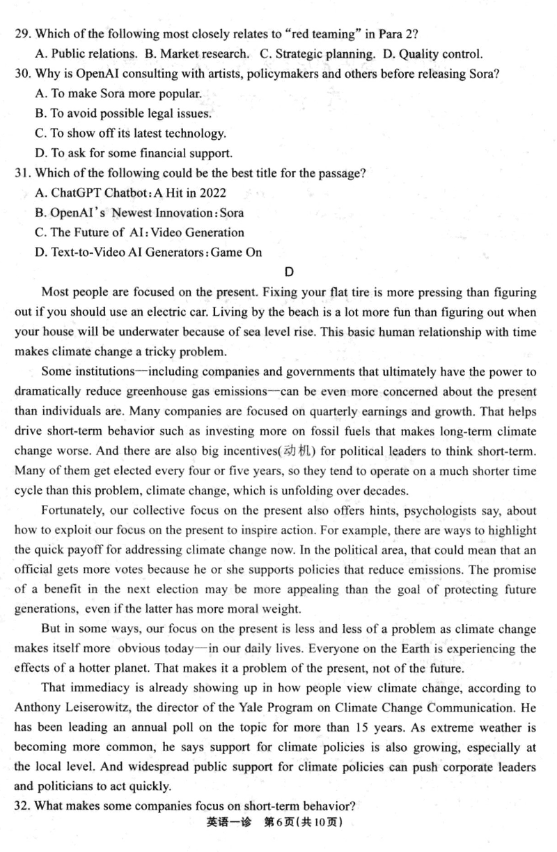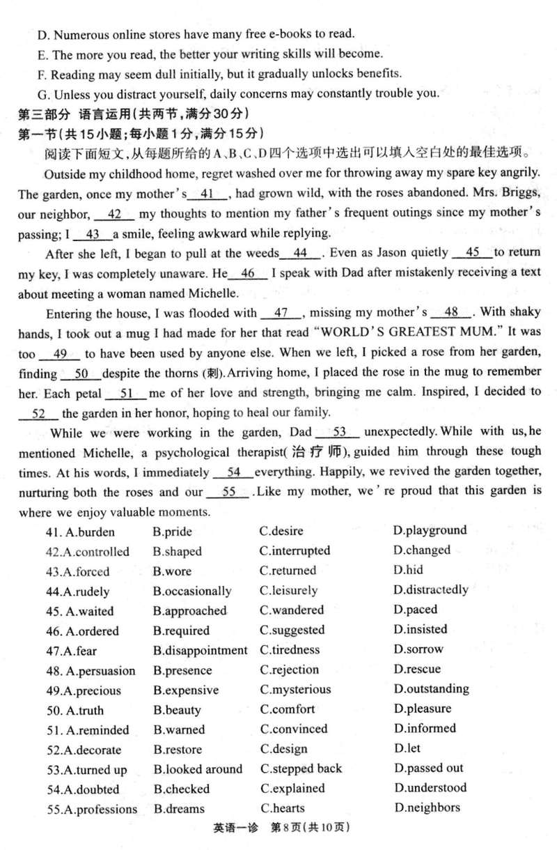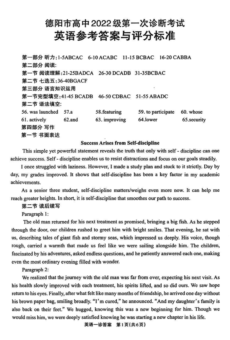 德阳一诊2025届高三第一次诊断考试英语试题及答案 时间:2024-12-05 17:19 四川 英语试题 德阳一诊2025届高三第一次诊断英语考试已于近日开考,为方便考生考后及时查看考试情况,查漏补缺、弥补不足,本文整理了试题答案解析相关信息! 汇总:德阳一诊2025届高三第一次诊断考试试题及答案汇总 英语试题及答案解析
