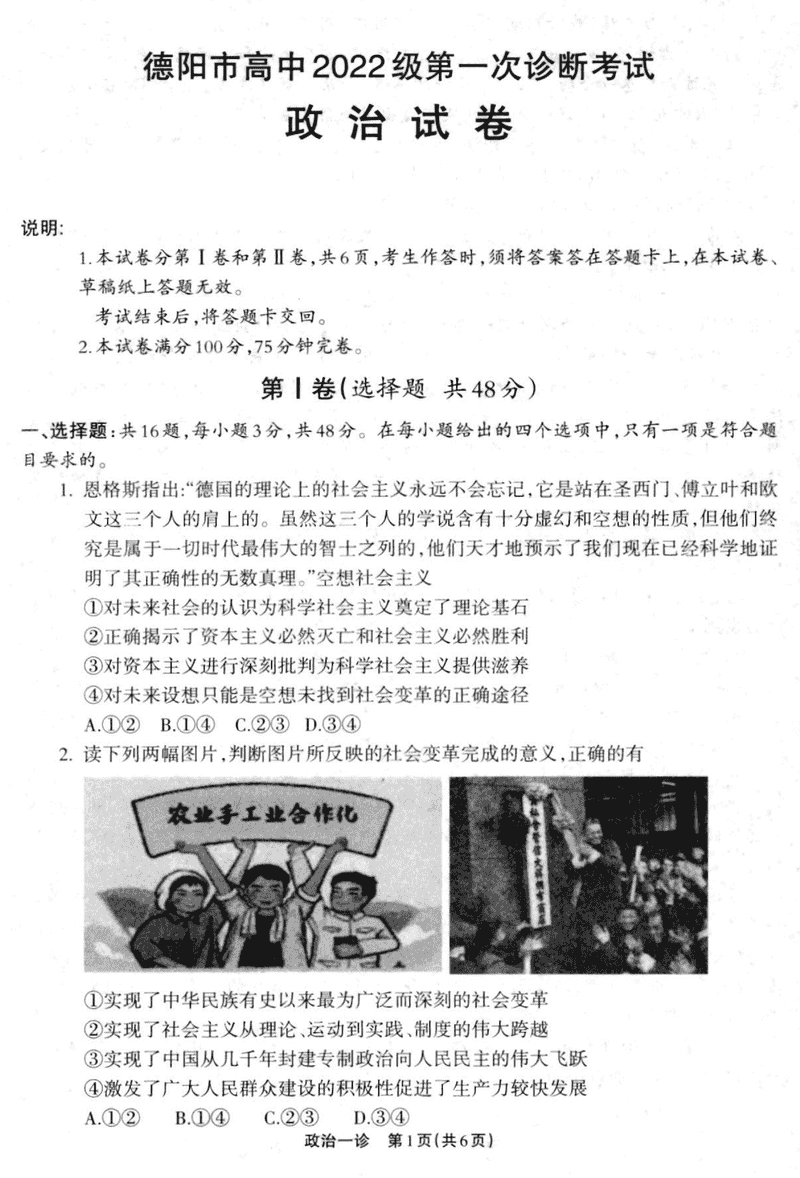 德阳一诊2025届高三第一次诊断考试政治试题及答案 时间:2024-12-05 17:20 四川 文综试题 德阳一诊2025届高三第一次诊断政治考试已于近日开考,为方便考生考后及时查看考试情况,查漏补缺、弥补不足,本文整理了试题答案解析相关信息! 汇总:德阳一诊2025届高三第一次诊断考试试题及答案汇总 政治试题及答案解析