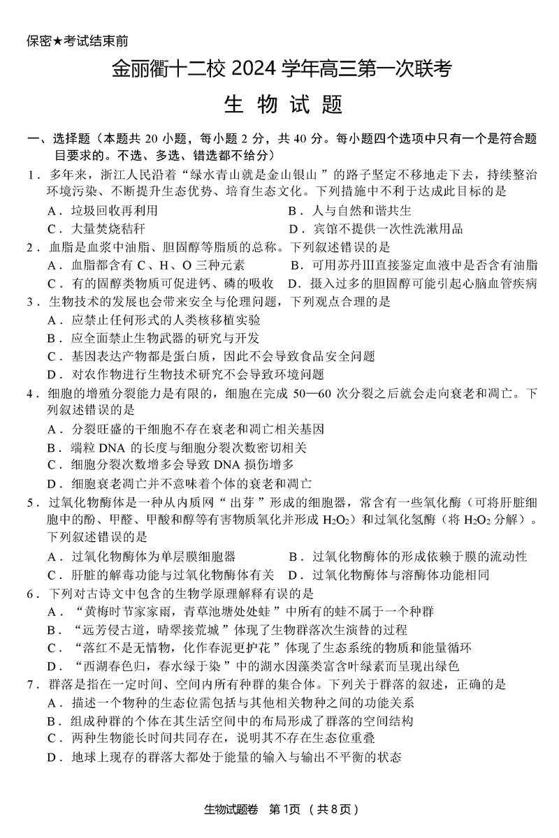 金丽衢十二校2024年高三上学期第一次联考生物试题及答案