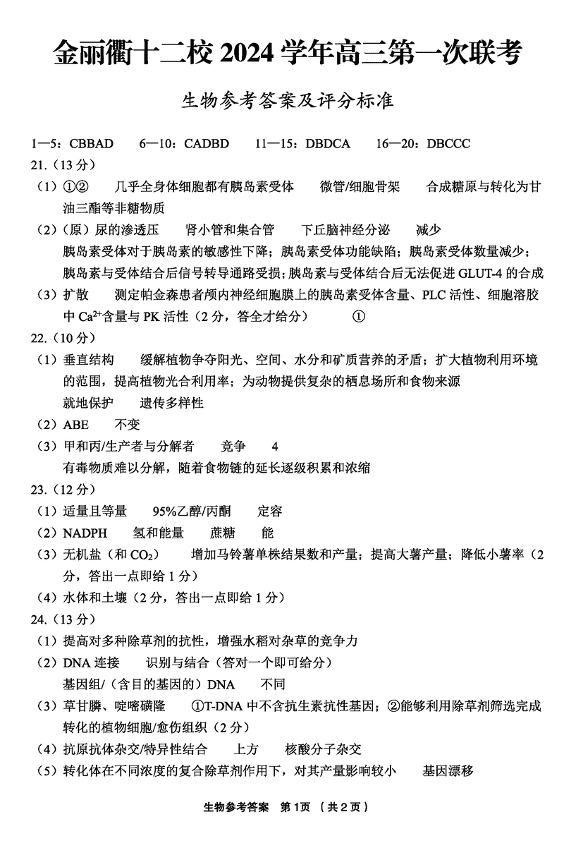 金丽衢十二校2024年高三上学期第一次联考生物考试已于近日开考,为方便考生考后及时查看考试情况,查漏补缺、弥补不足,本文整理了试题答案解析相关信息!
