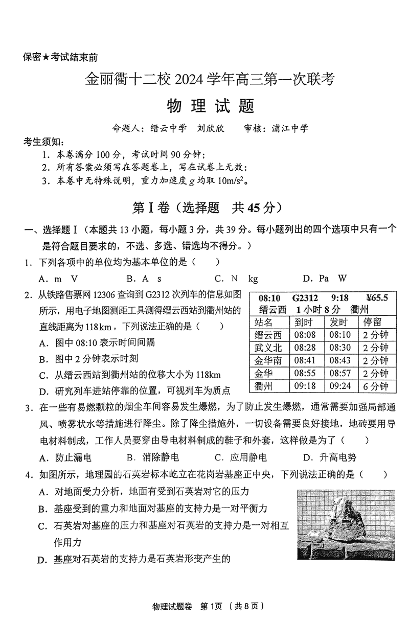 金丽衢十二校2024年高三上学期第一次联考物理试题及答案