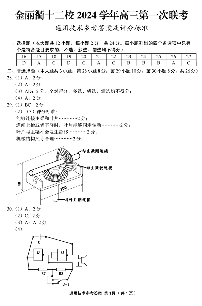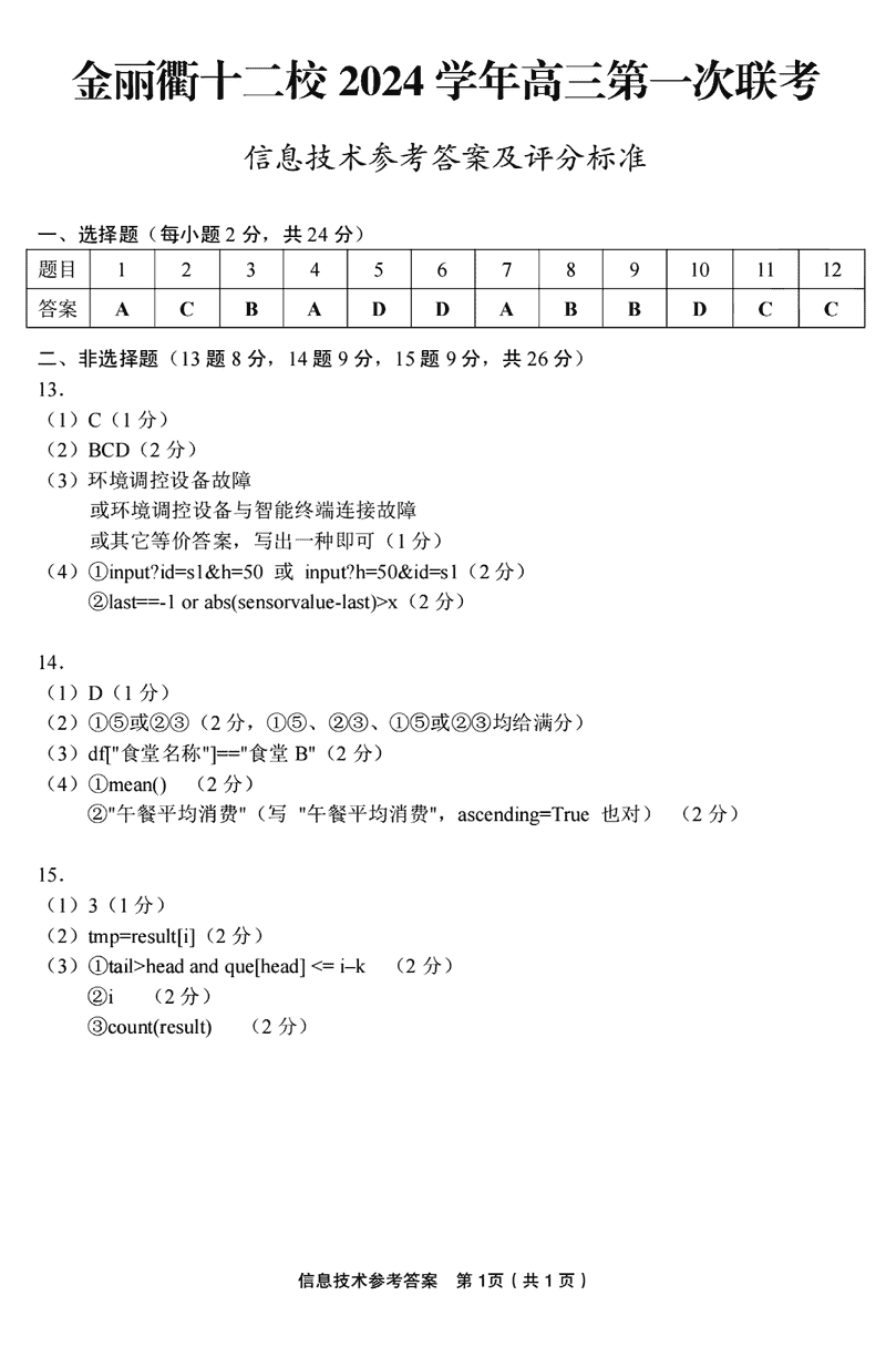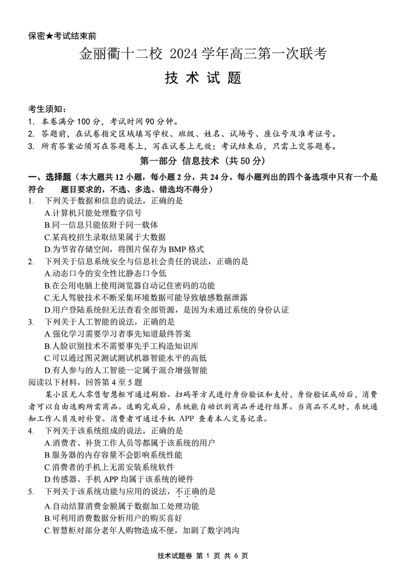 金丽衢十二校2024年高三上学期第一次联考技术试题及答案