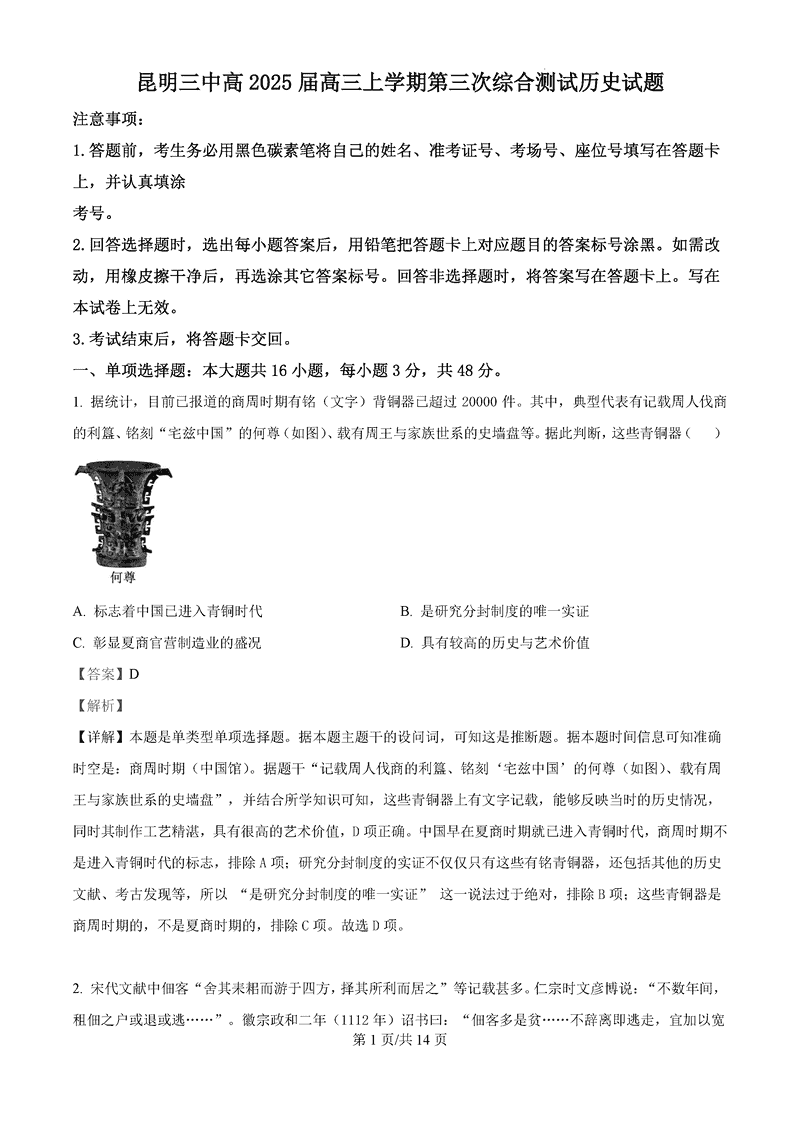 昆明三中2024-2025学年高三上学期11月月考历史考试已于近日开考,为方便考生考后及时查看考试情况,查漏补缺、弥补不足,本文整理了试题答案解析相关信息!