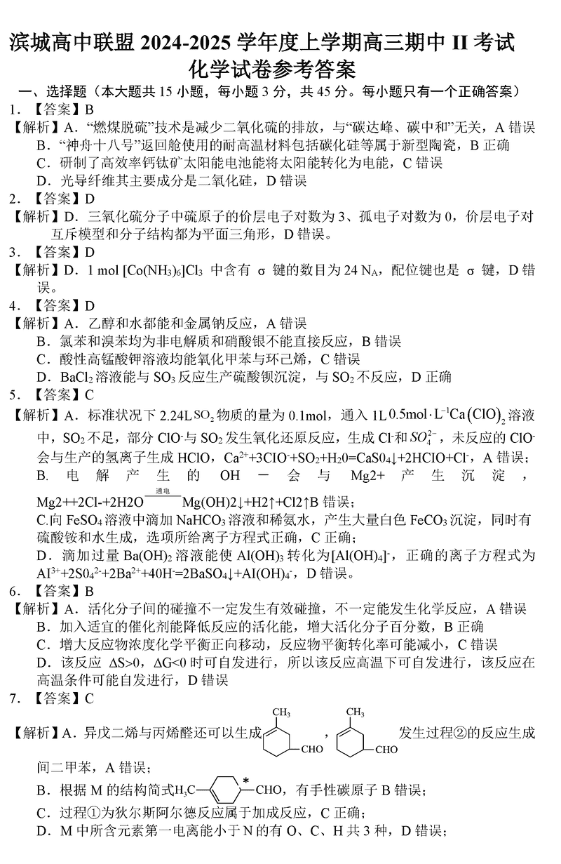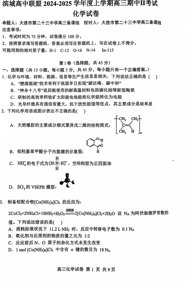 大连滨城高中联盟2025届高三上学期期中Ⅱ化学考试已于近日开考,为方便考生考后及时查看考试情况,查漏补缺、弥补不足,本文整理了试题答案解析相关信息!