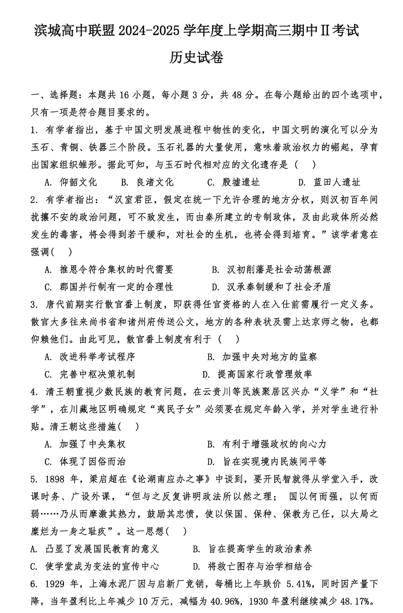 大连滨城高中联盟2025届高三上学期期中Ⅱ历史试题及答案