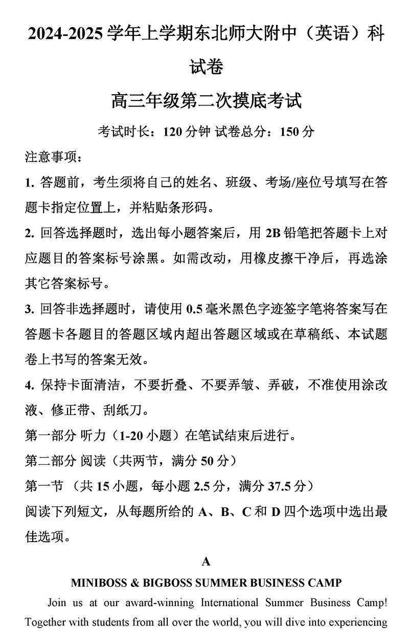 东北师大附中2024-2025学年高三第二次摸底英语考试已于近日开考,为方便考生考后及时查看考试情况,查漏补缺、弥补不足,本文整理了试题答案解析相关信息!