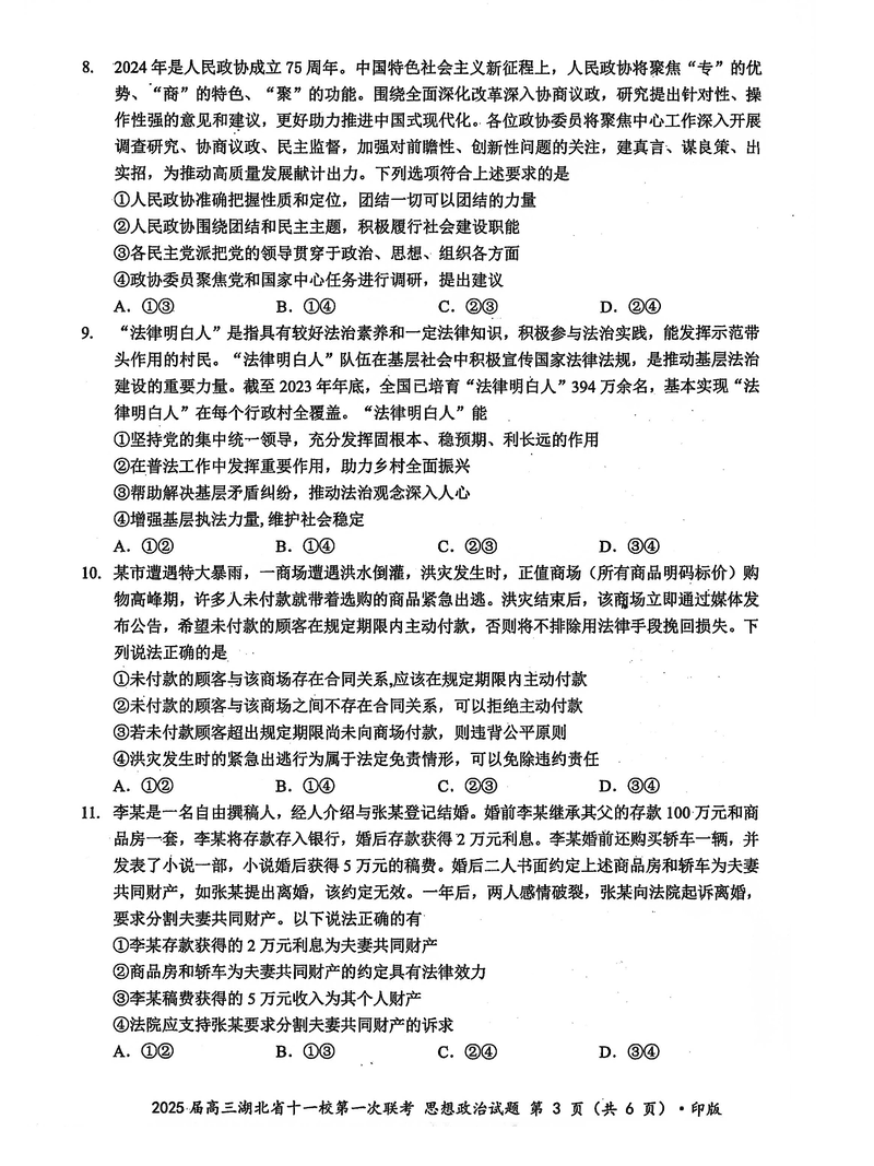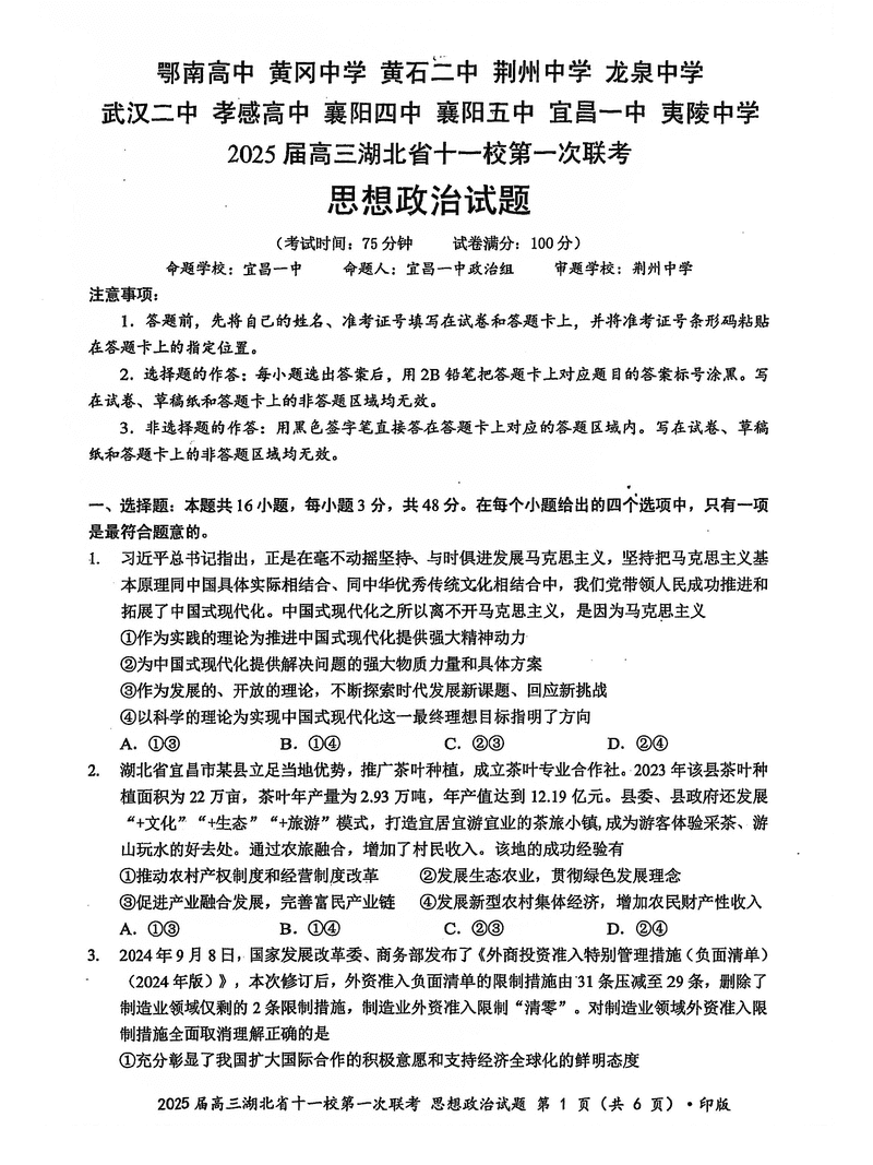 湖北十一校2025届高三12月第一次联考政治试题及答案